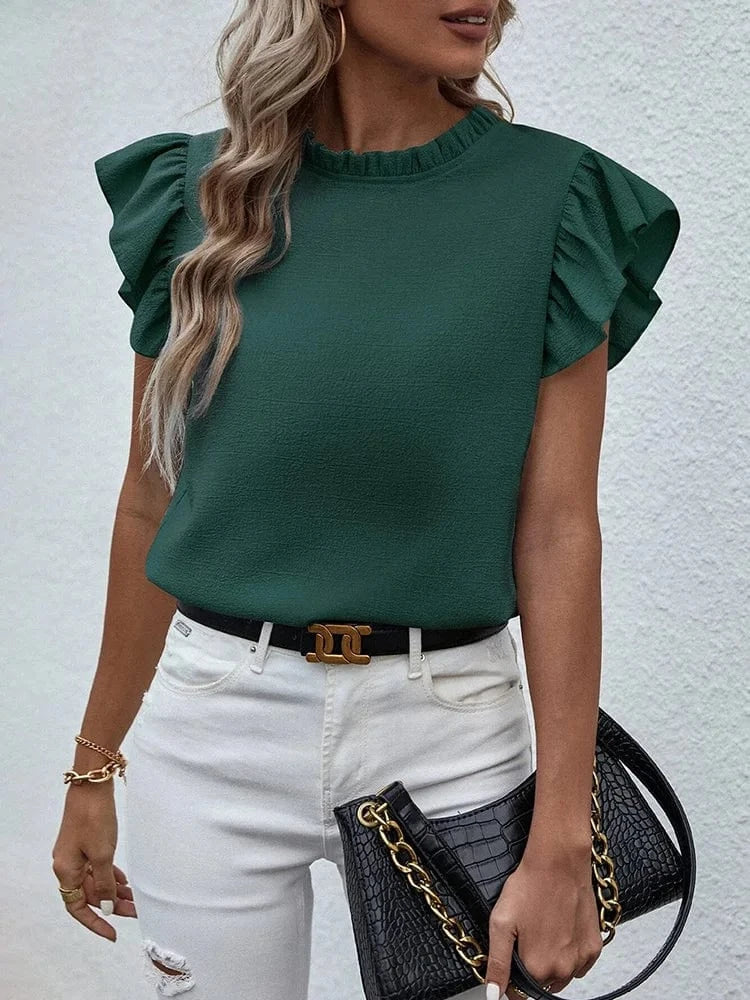 - Feminin volangdetalj – fjärilsärmarna skapar en romantisk och elegant look.