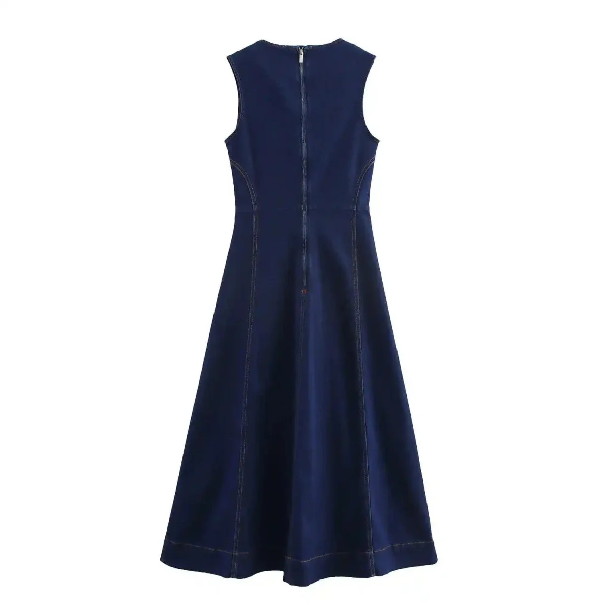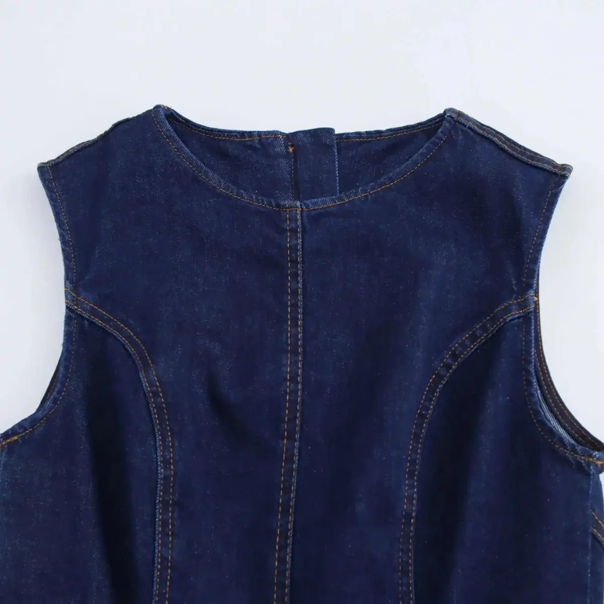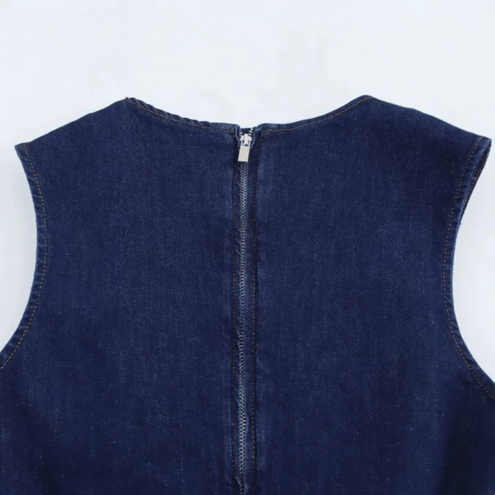 Letar du efter en klänning som kombinerar cowboy-attityd med ren elegans? Denna ärmlösa mörka denimklänning bjuder på en smickrande A-linjeform, vackra kontrastsömmar och en silhuett som rör sig mjukt med varje steg. Perfekt för dagar då du vill känna dig både fri, bekväm och självklar i din stil.