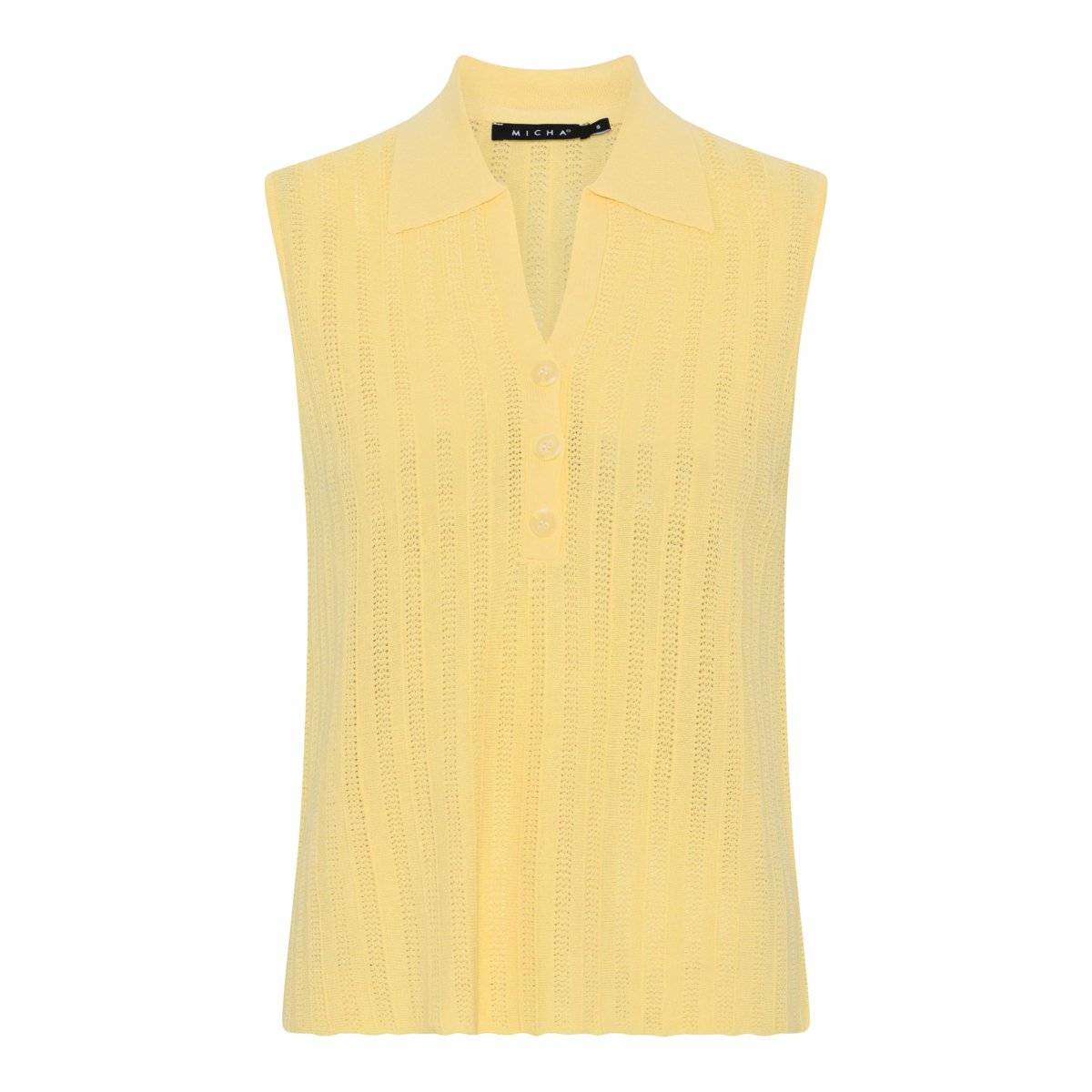 Härlig ärmlös top med krage i vårens fantastiska gula färg. Knappar framtill och något rakare i modellen. Använd den som den är eller sätt en långärmad top under innan sommarvärmen är här.