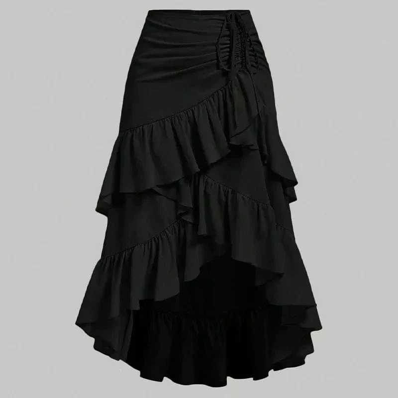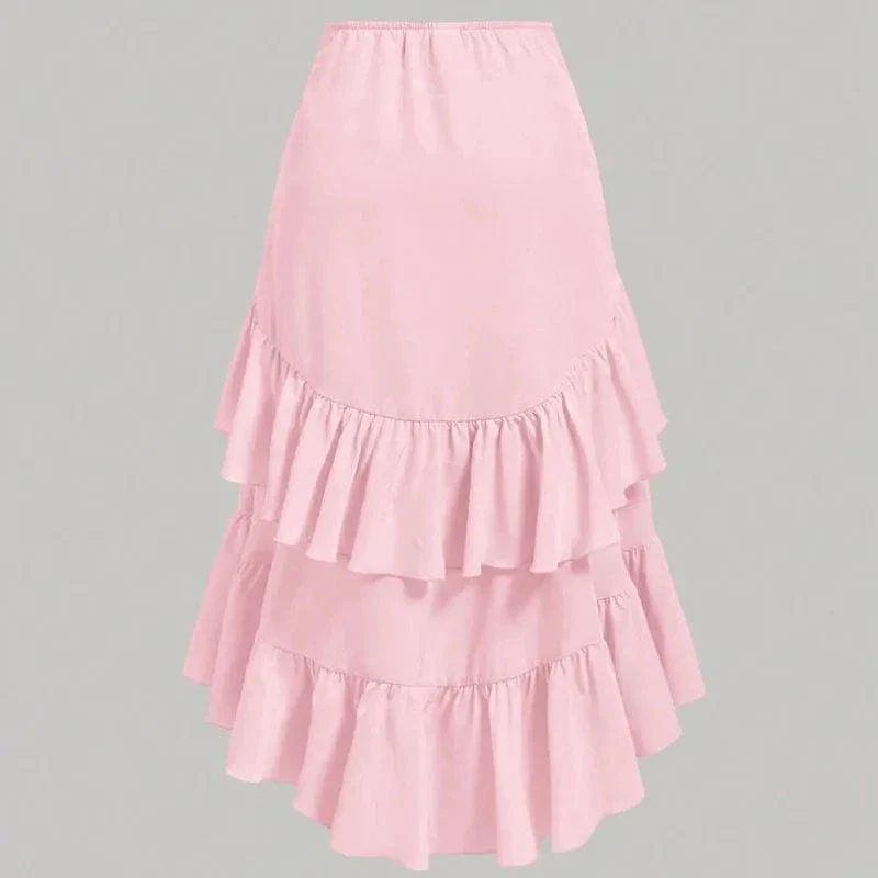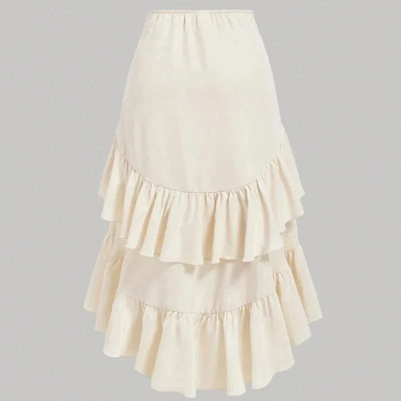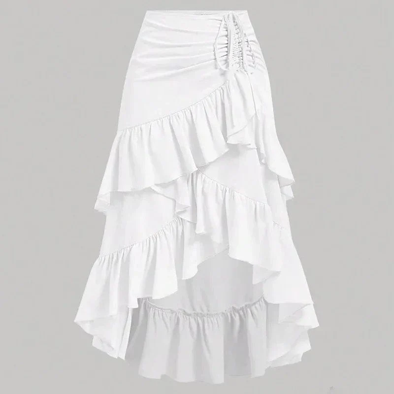 Låt denna asymmetriska långkjol med mjuka volanger och elegant drapering föra in en lekfull, men ändå sofistikerad energi i din garderob. Perfekt för både heta sommardagar och kvällar fyllda av dans och skratt.