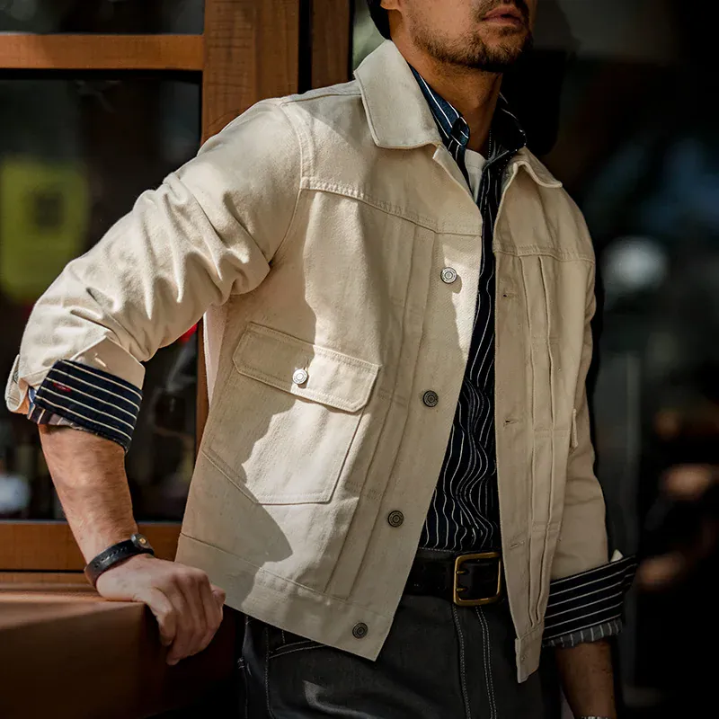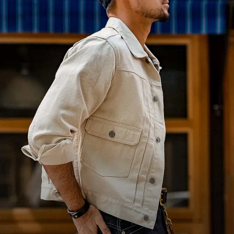 Beige jeans jacka herr som lyfter din vardagsstil med tidlös westernkänsla