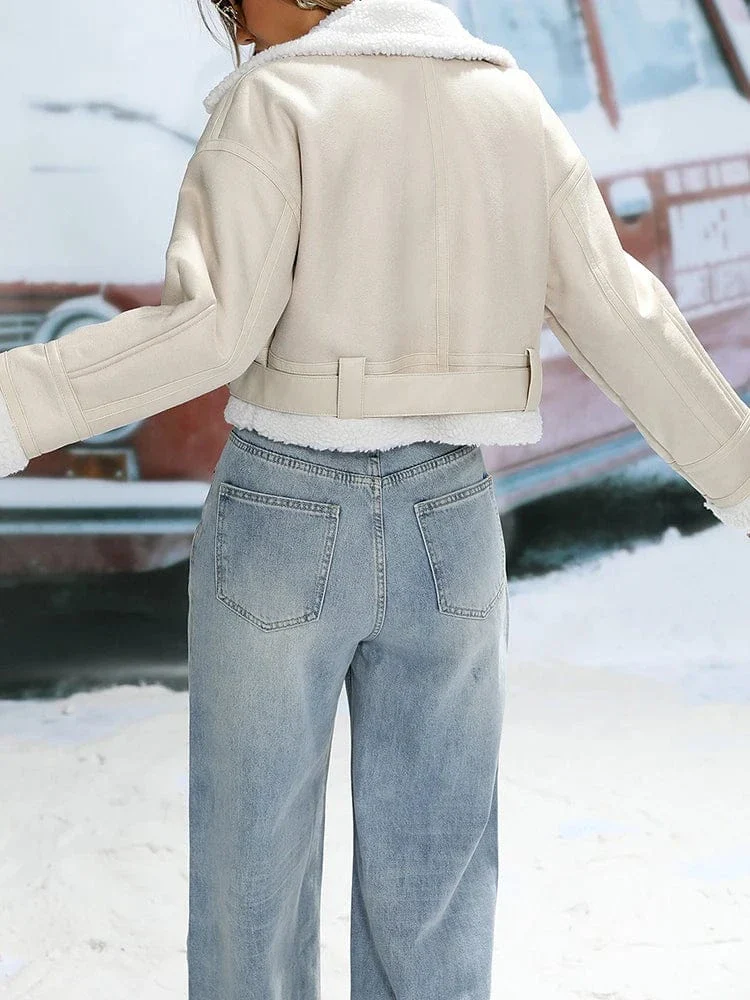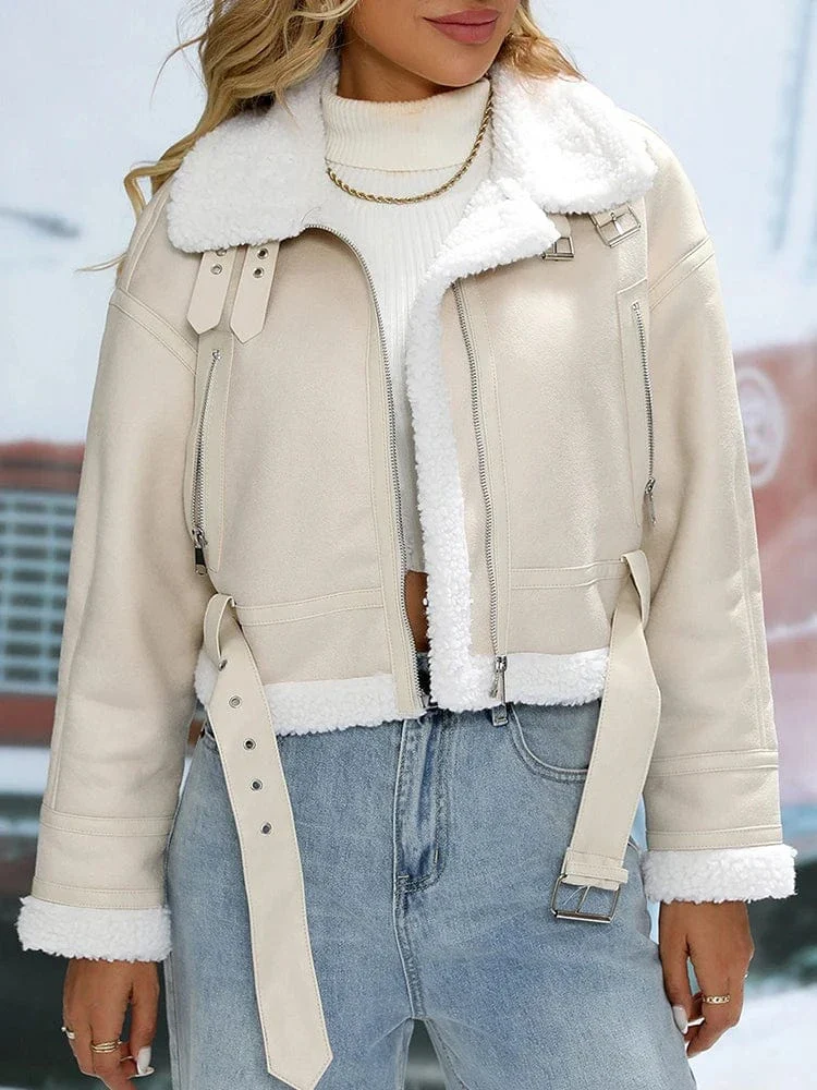 Beige pilotjacka dam med fuskpäls – varm stil för kalla dagar