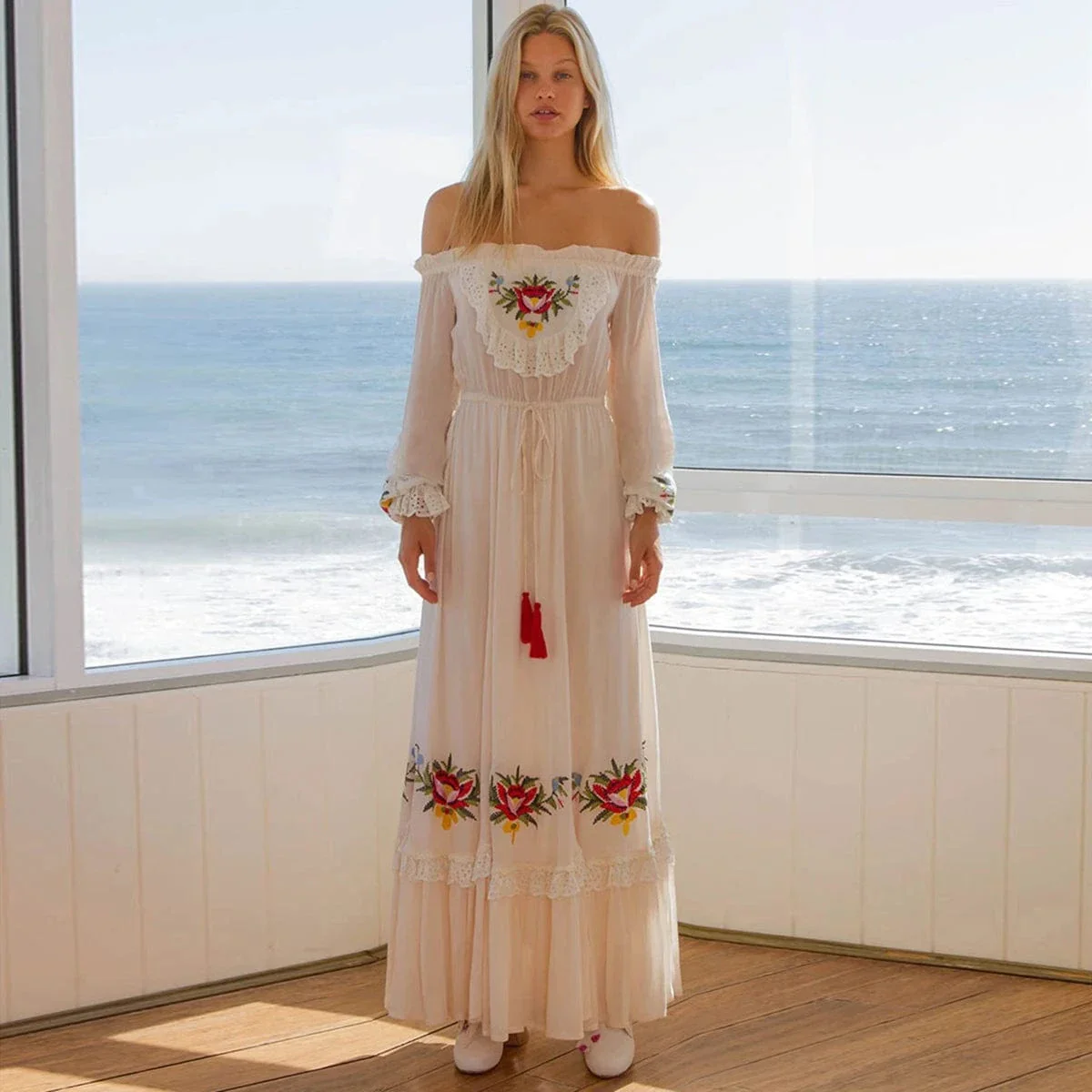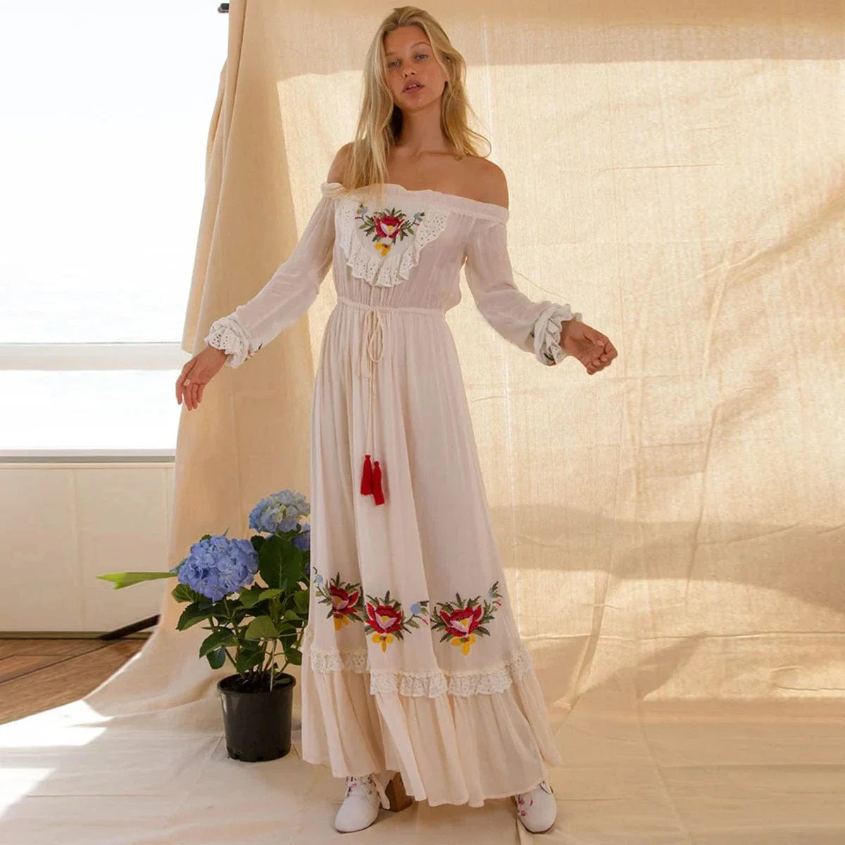 Lyft din stil med vår vita boho chic klänning – en svepande maxiklänning med broderade blommor och off-shoulder-design som utstrålar både frihet och elegans.