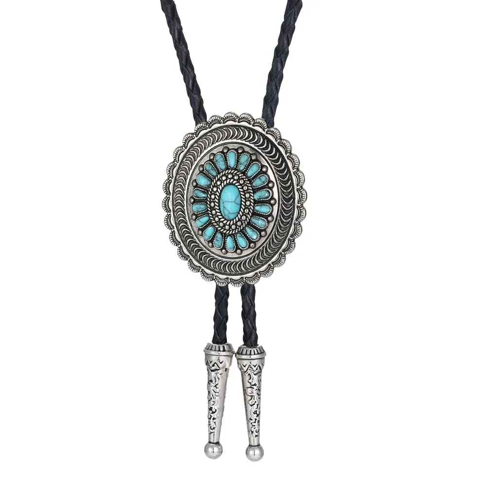 Ge din outfit en karaktärsfull finish med denna bolo tie i solrosformad metallram och turkos sten. En sofistikerad accessoar för dig som älskar det oväntade – perfekt balanserad mellan klassisk western och modern stil.