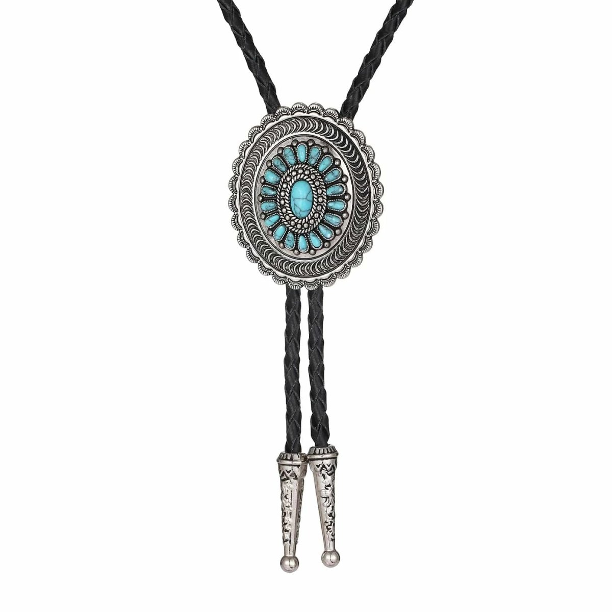 Bolo tie i solrosformad metallram och turkos sten – din eleganta westerndetalj