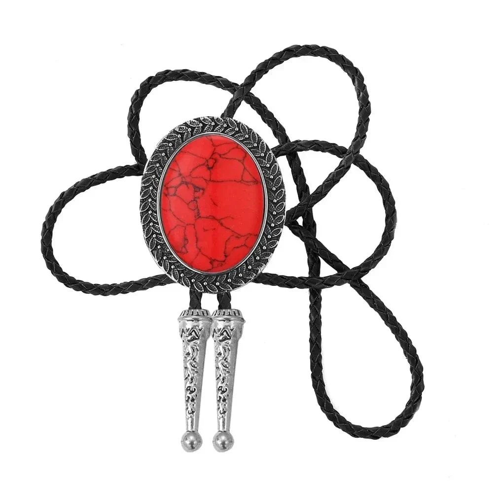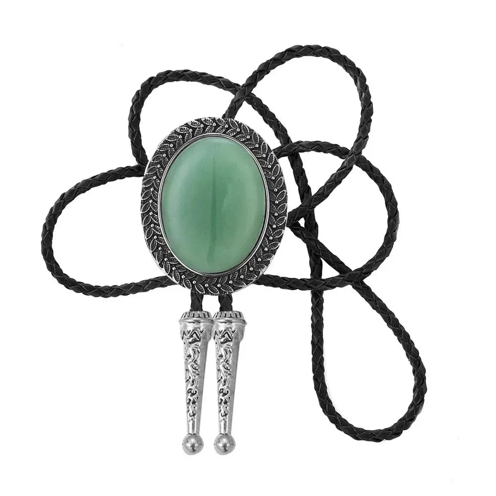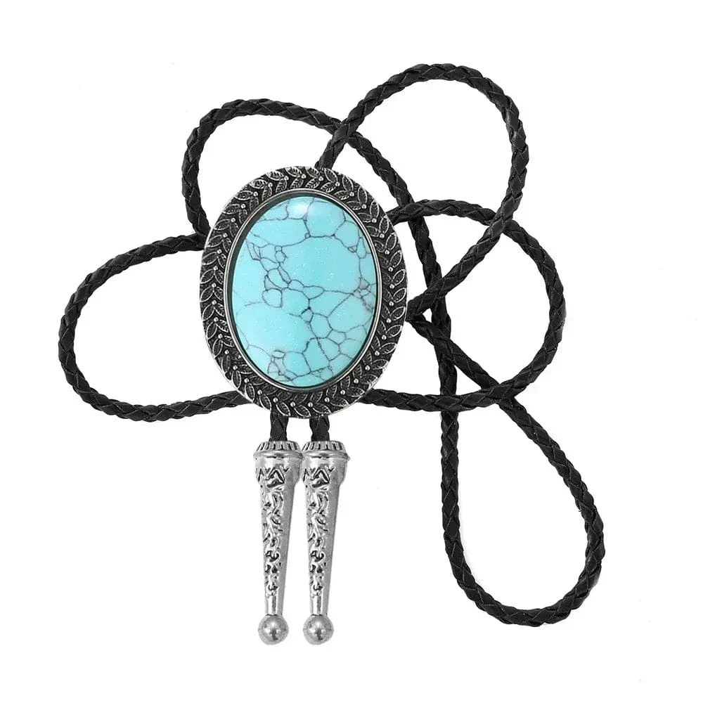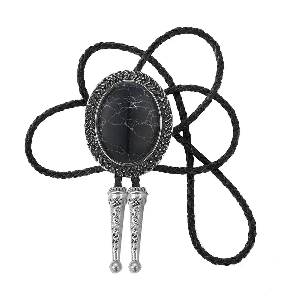 Den här bolo tie är mer än bara en accessoar – det är ett stiluttalande. Den stora ovala stenen, infattad i en metallram med karvad kant, skapar en harmonisk balans mellan westerninspiration och modern elegans.