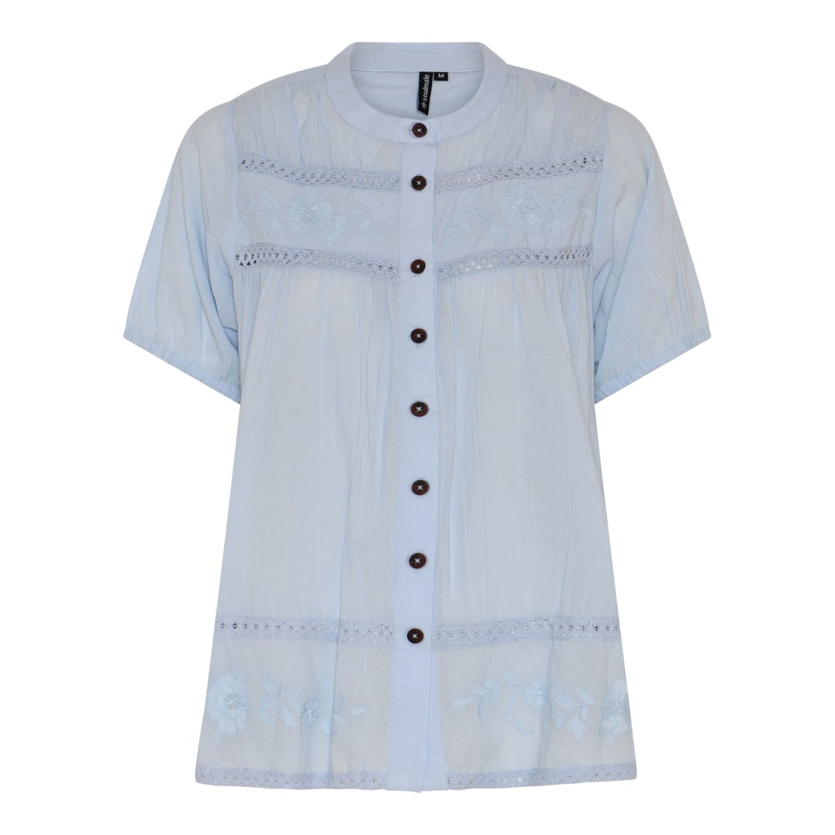 Vacker dekorativ ljusblå blus från Soulmate. Genomgående knäppning med fina knappar samt kort ärm med resårkant.