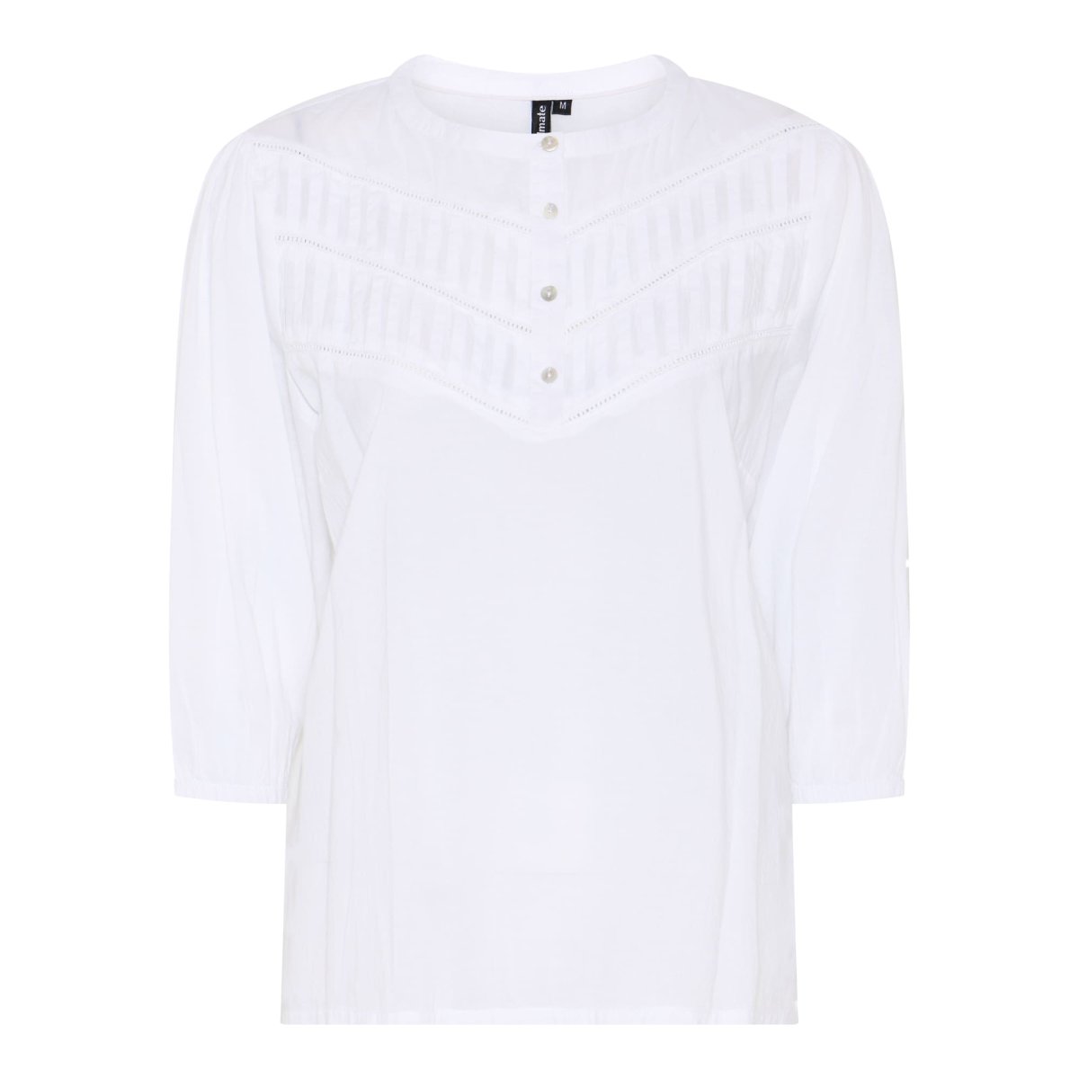 Härlig lätt blus i 100% bomull från Soulmate. Blusen har 3/4-lång ärm med resårkant nedtill samt rund hals med knäppning upptill. Fint detaljerat mönster upptill.