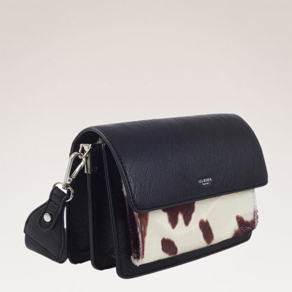 Boxväska med trendigt ko mönster. Tre fack varav ett med dragkedja. Avtagbar axelrem.