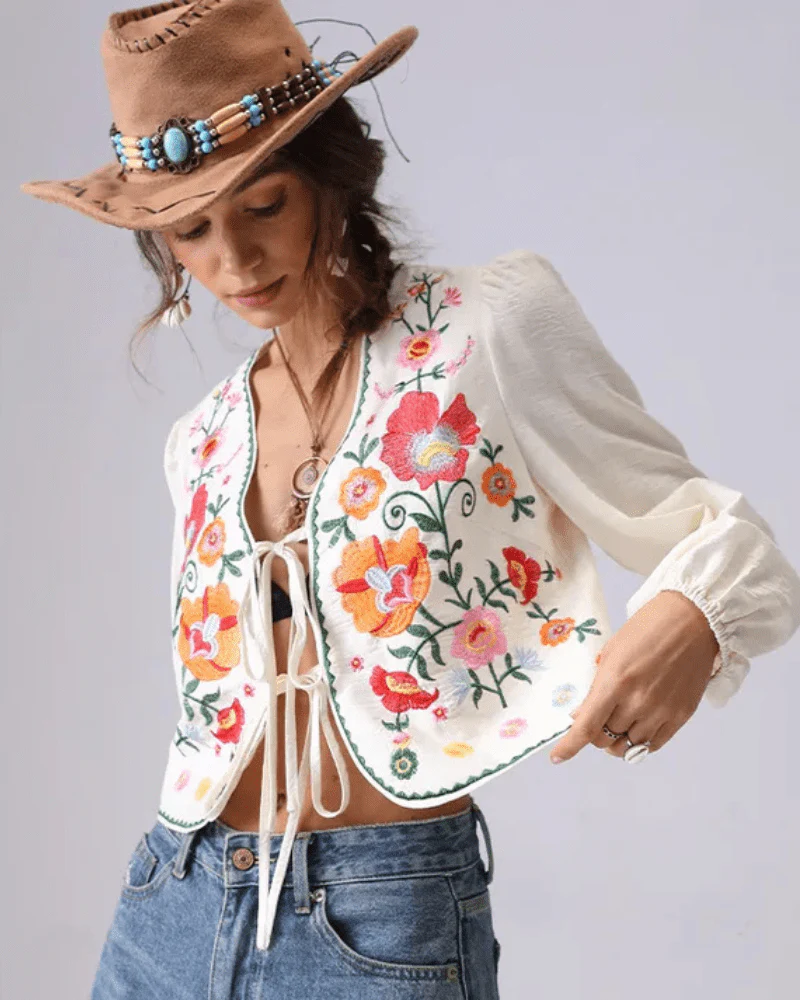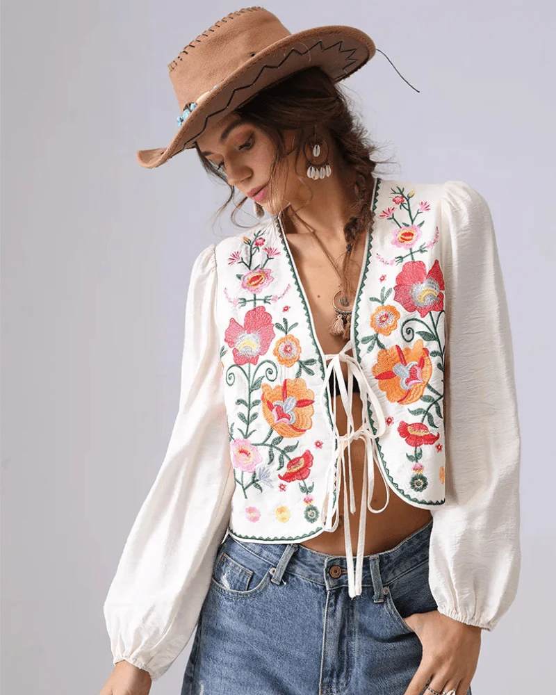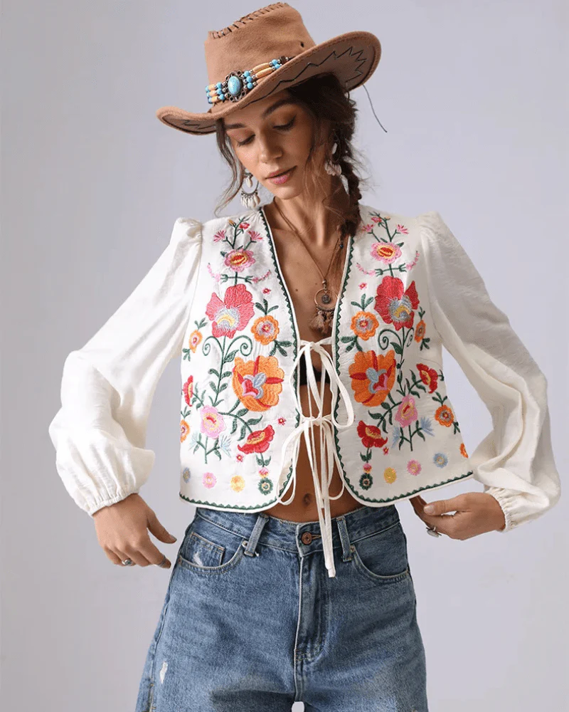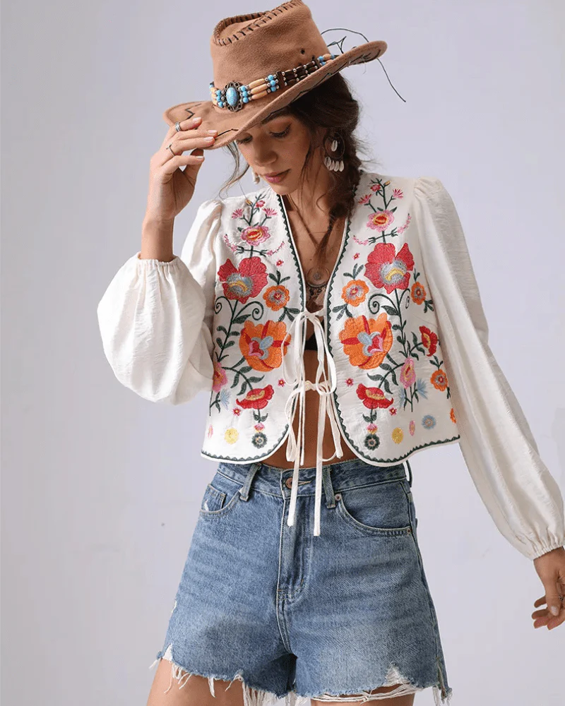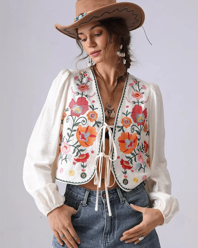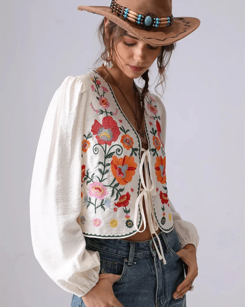 Denna charmiga blus förmedlar en känsla av frihet och femininitet med sina levande blombroderier och eleganta knytband. Perfekt för vårens och sommarens alla tillfällen – från vardag till semester.