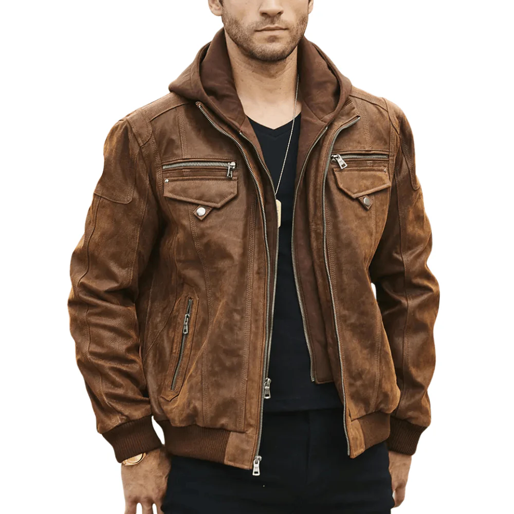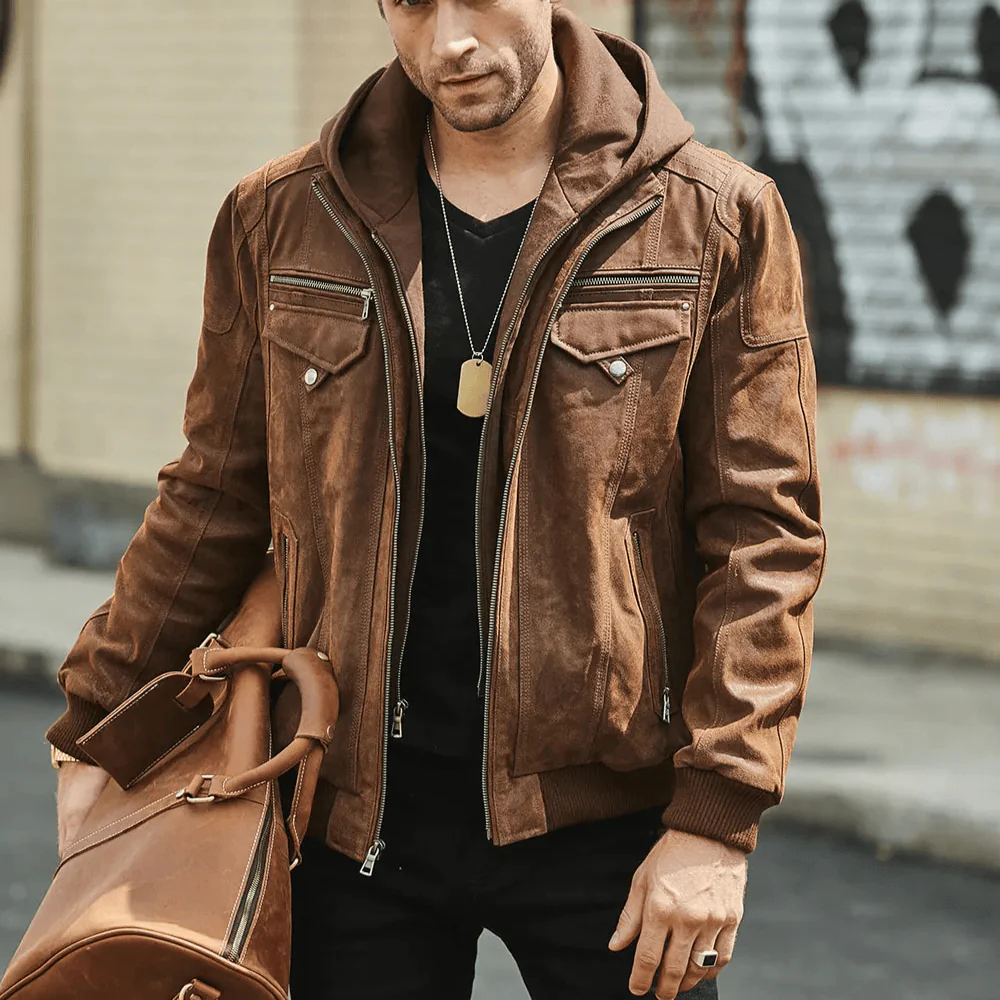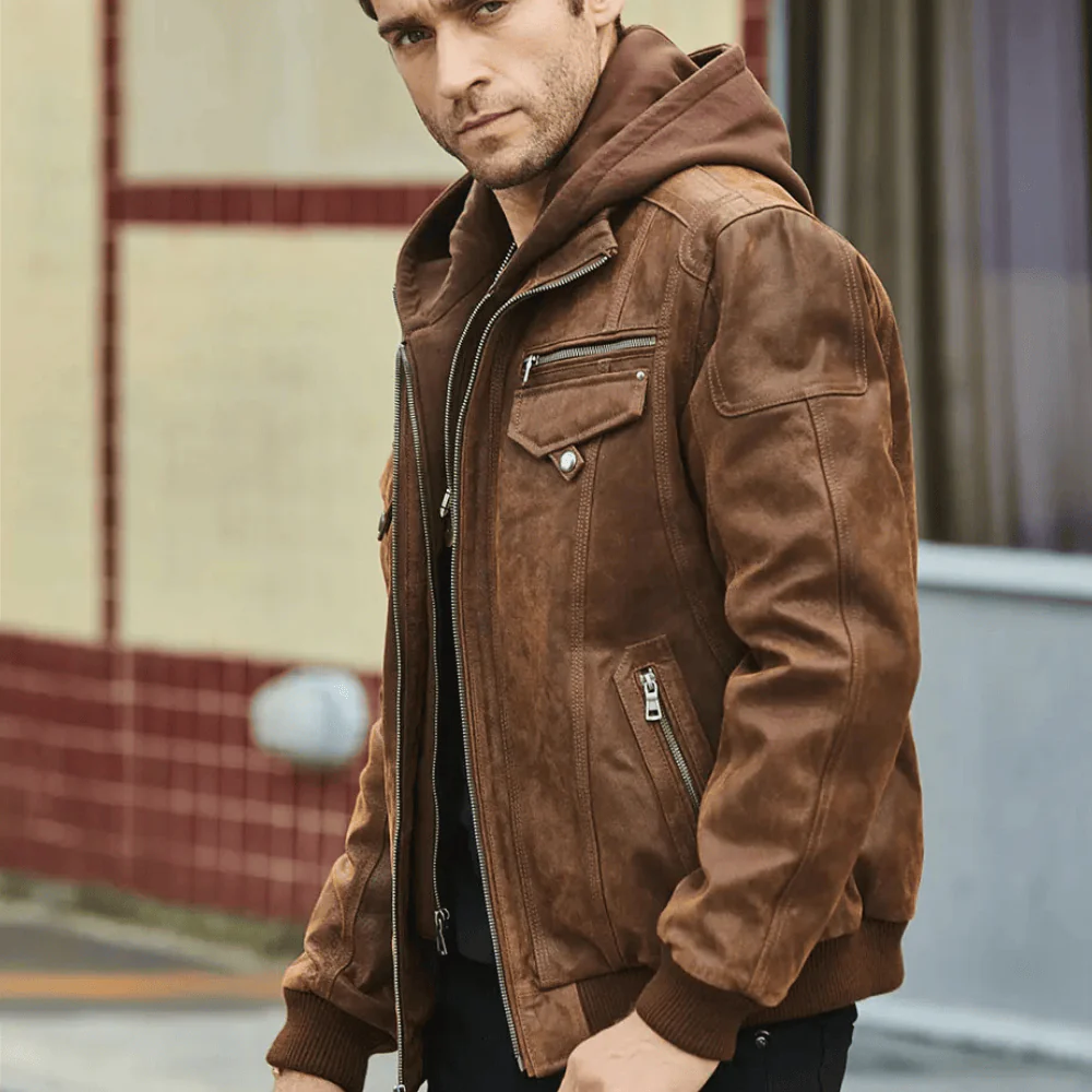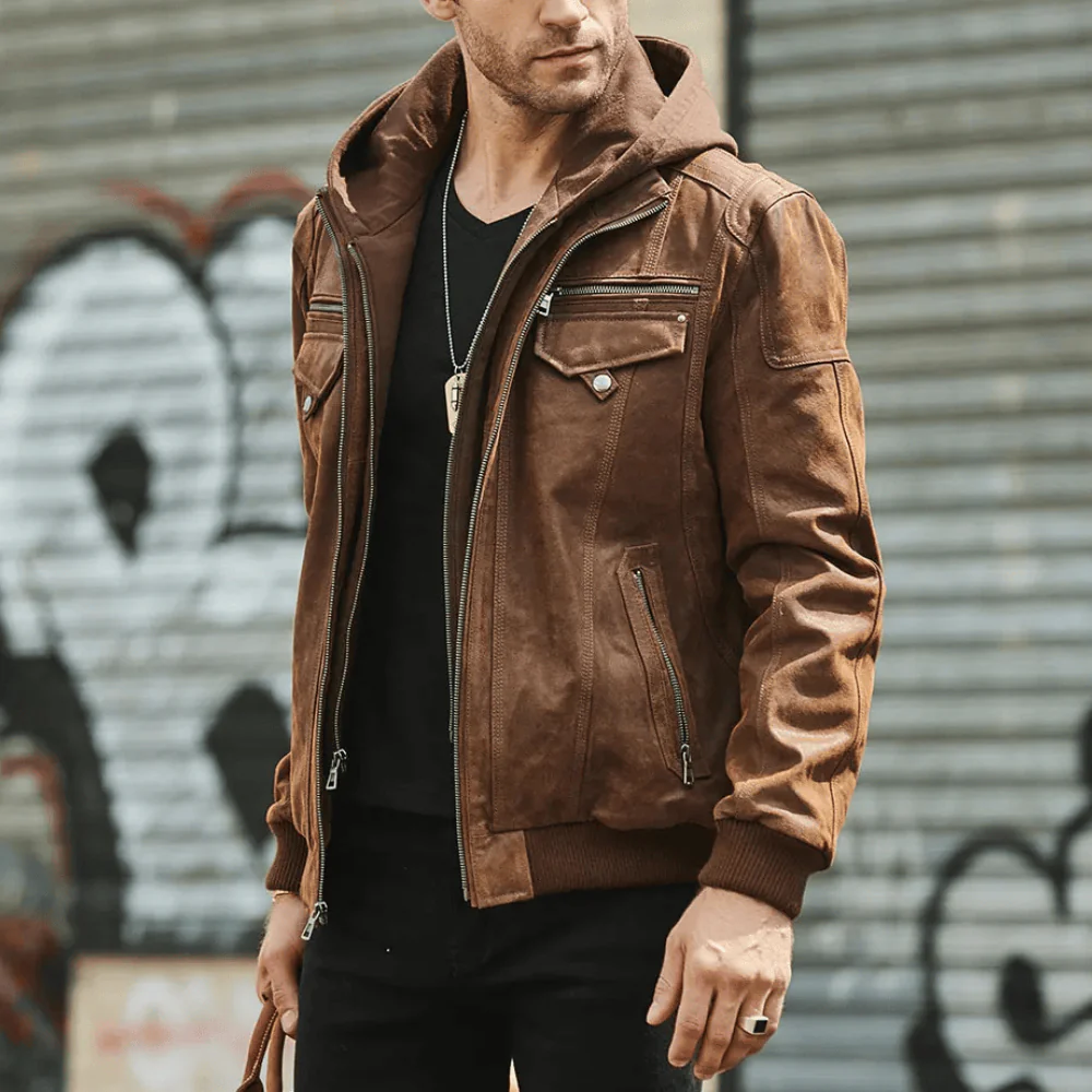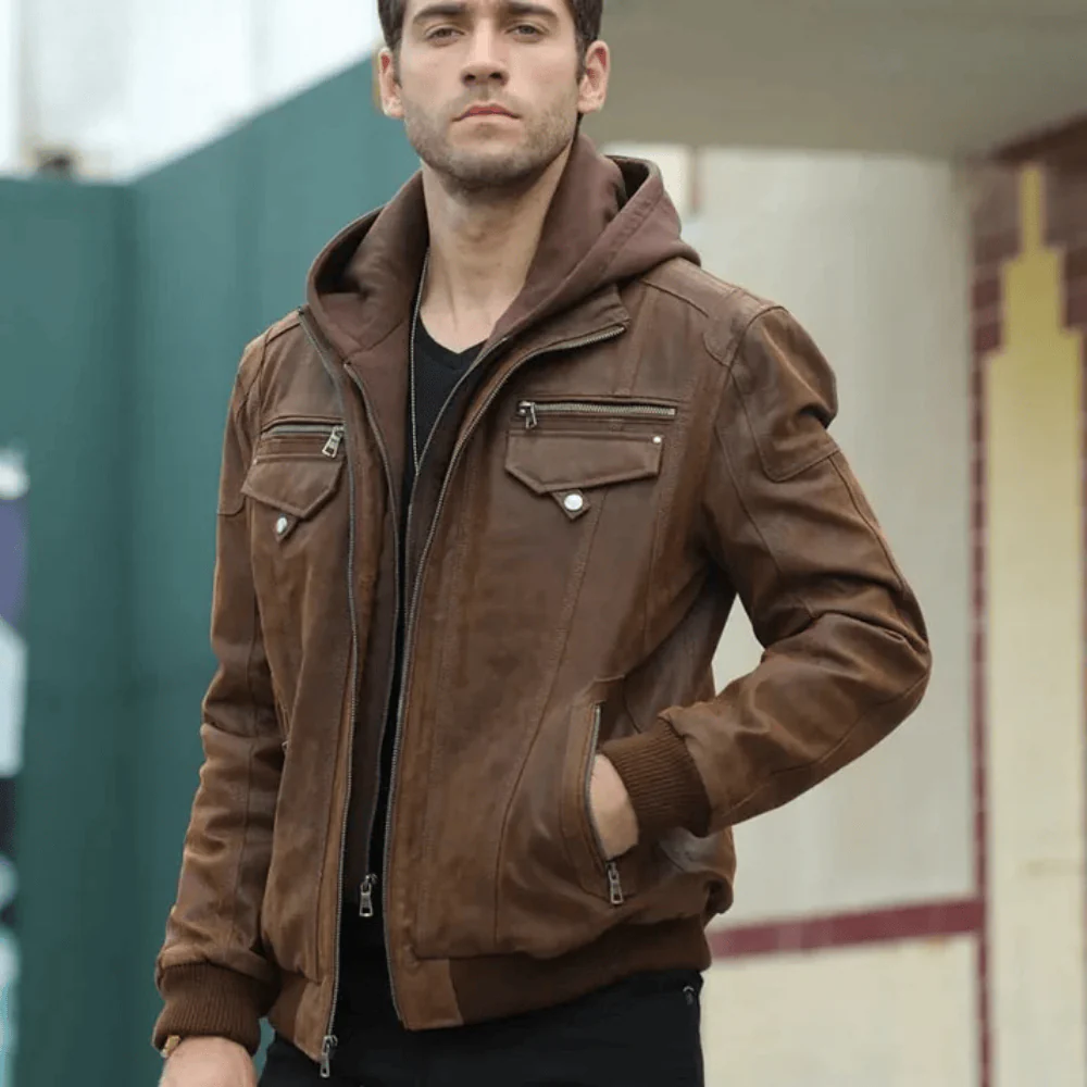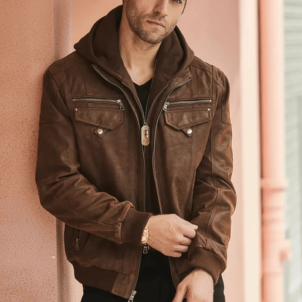 Brun läder jacka med huva herr som definierar din vinterstil