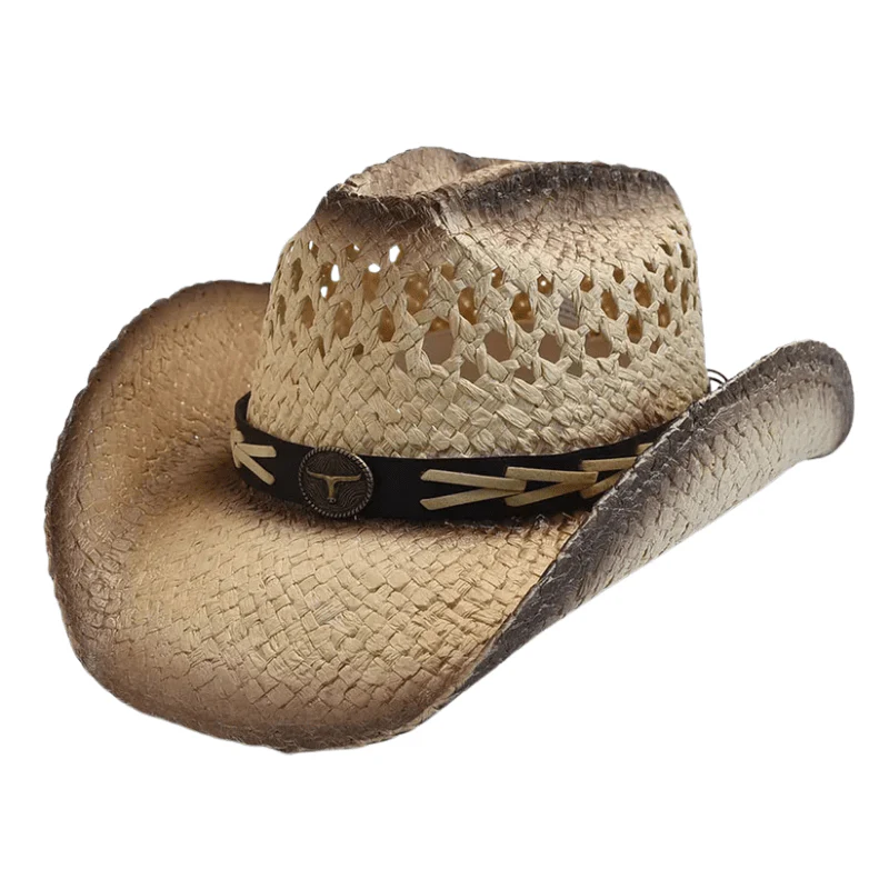 - Tidlös westernstil – dekorerad med ett mörkt band och metallspänne med hornmotiv för autentisk charm.