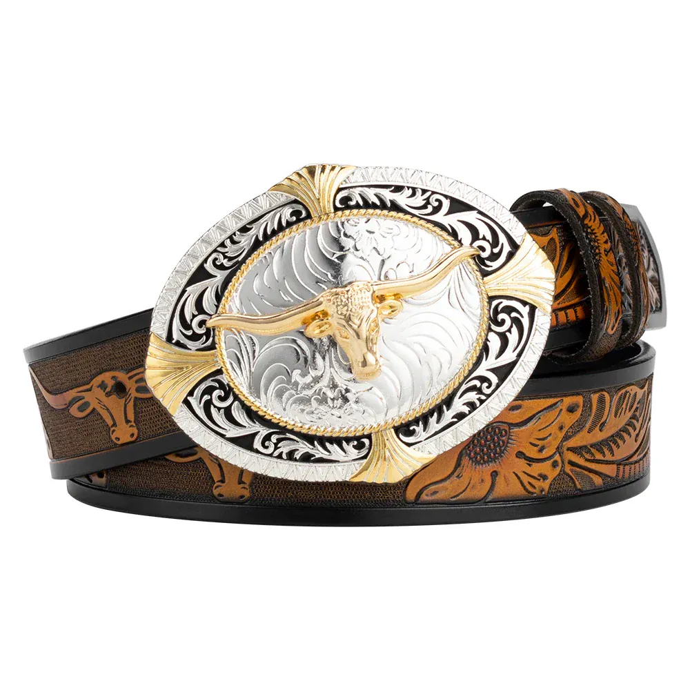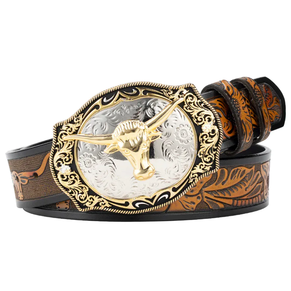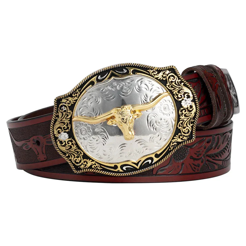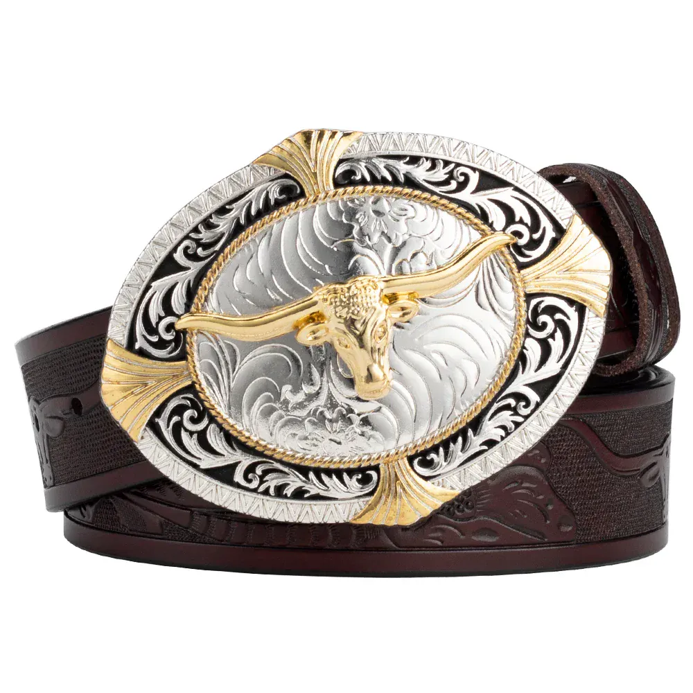 Cowboybälte i läder med tjurhuvudspänne som gör varje outfit legendarisk