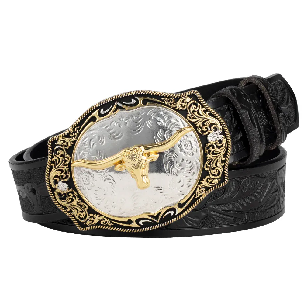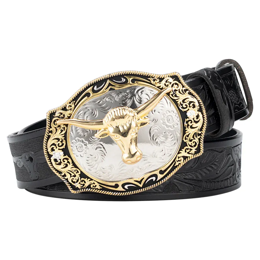 - Ikoniskt bältesspänne i metall – det detaljerade tjurhuvudet i silver och guld skapar en kraftfull look.