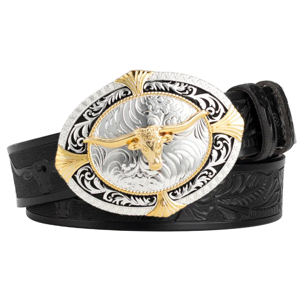 Låt din stil tala lika högt som din själ. Det här cowboybältet i äkta delat läder, prytt med ett mäktigt tjurhuvud i metall, är mer än ett tillbehör – det är ett statement. Perfekt för dig som älskar Western-stilen, country-livet och känslan av frihet i varje steg.