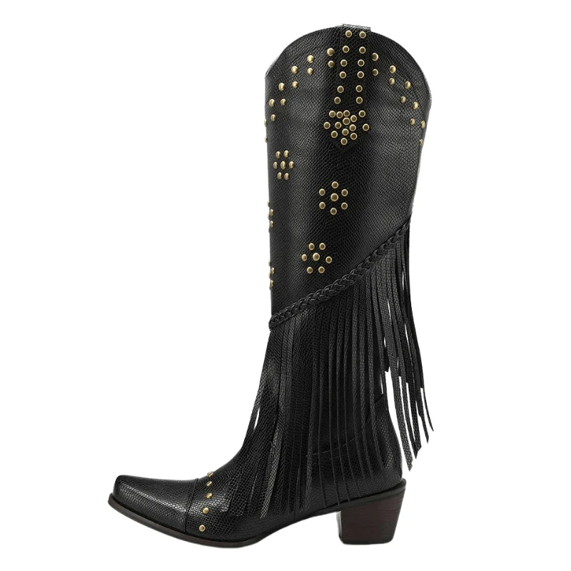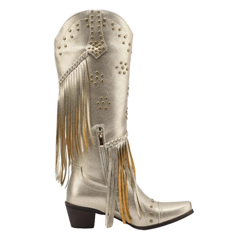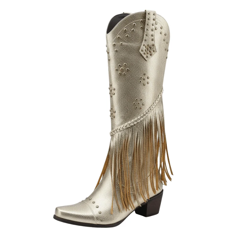 Upptäck ett par boots som får hela outfiten att leva. Dessa knähöga cowboyboots kombinerar western-attityd med glittrande detaljer och sensuell fransrörelse. Ett statement för dig som älskar att ta plats – på dansgolvet, på klubben eller i vardagens catwalk. Sätt på dem och känn hur självsäkerheten växer direkt.