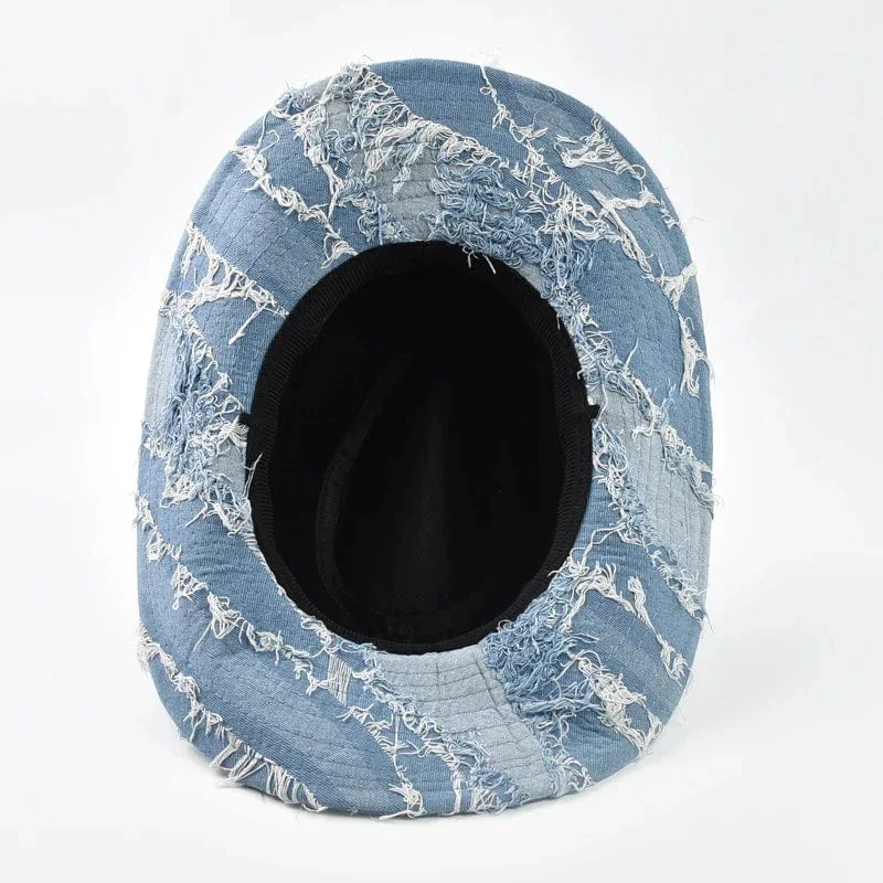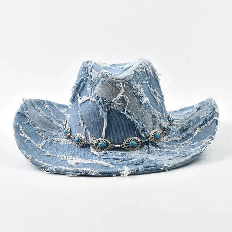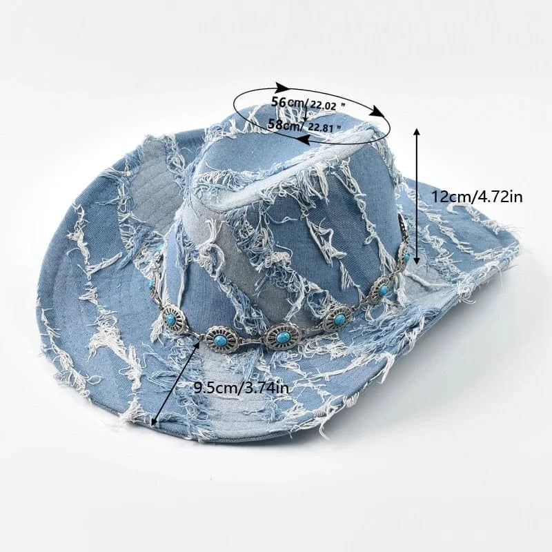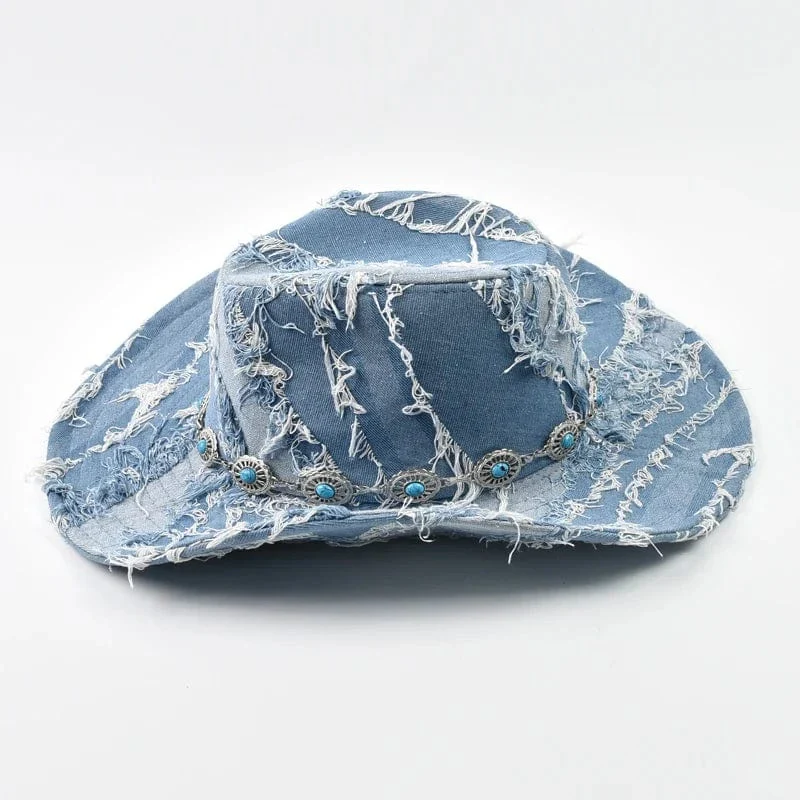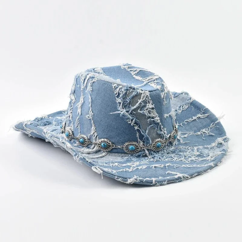 - Unik design: Varje hatt har slitna denimdetaljer som ger en rustik och autentisk känsla.