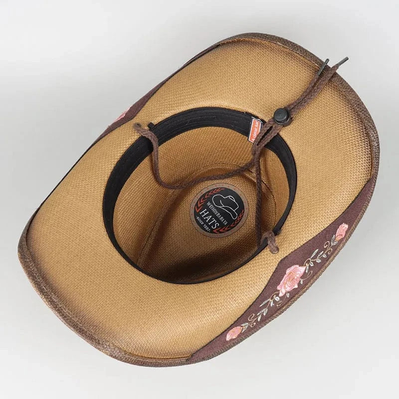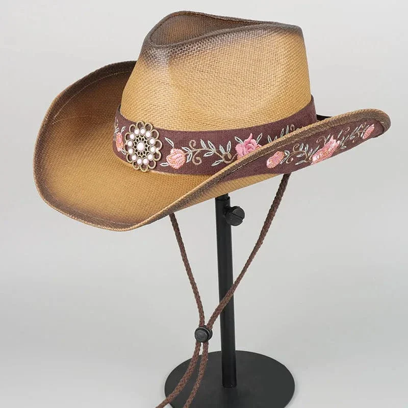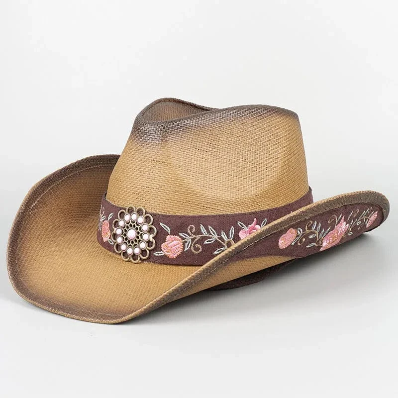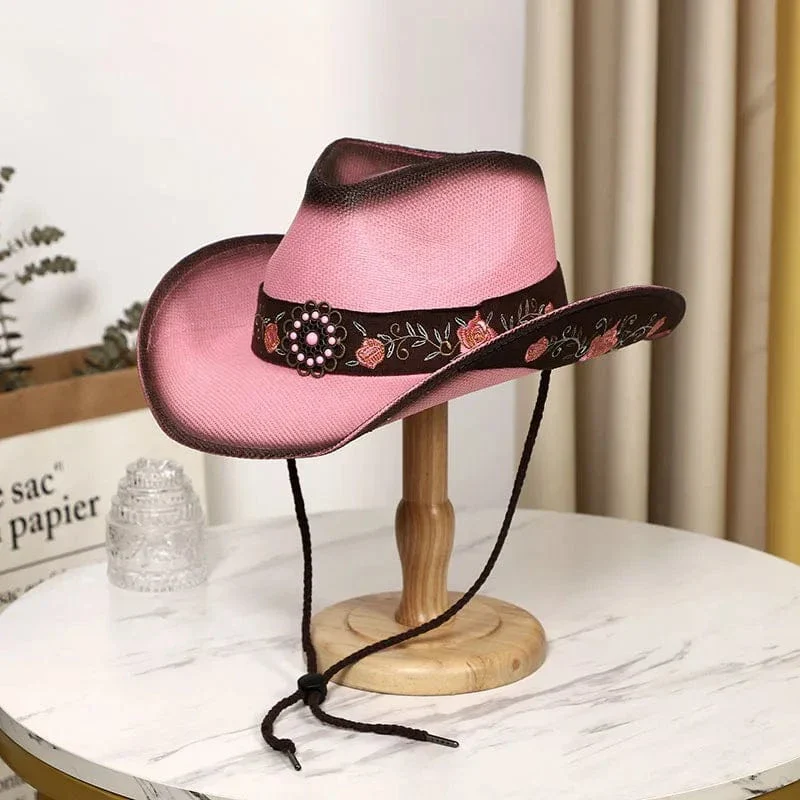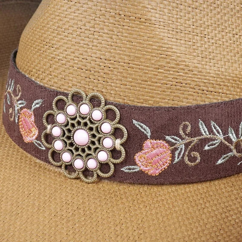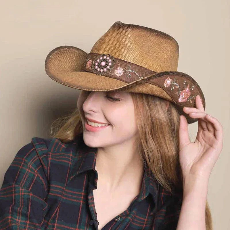 Lyft din sommarlook med vår förtrollande cowboyhatt för kvinnor – en perfekt kombination av charmig västernstil och tidlös elegans. Med sina broderade rosdetaljer, dekorativt spänne och mjuka nyanser är den skapad för dig som vill utstråla både självsäkerhet och femininitet under varma dagar.