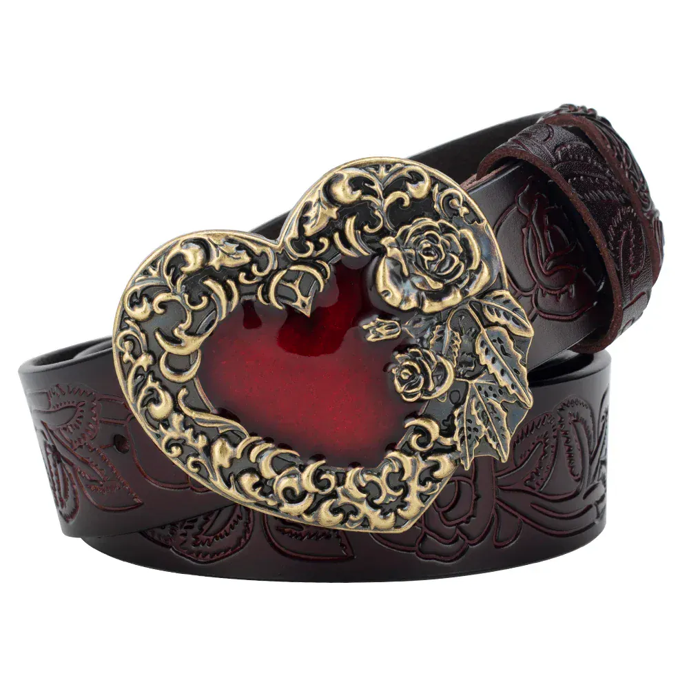 Upptäck en tidlös symbol för romantisk västernstil med vårt eleganta cowboyläderbälte med roshjärtspänne. Det är mer än bara ett bälte, det är ett statement av självsäkerhet och passion. Med sitt hjärtformade spänne, utsmyckat med rosdetaljer och ett djupt rött centrum, förvandlar det varje outfit till ett konstverk.