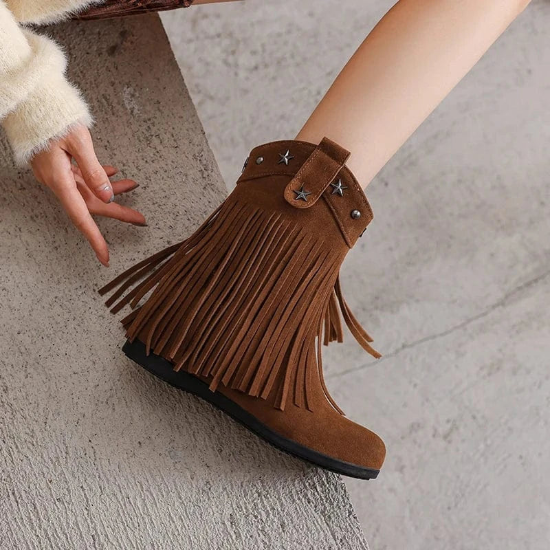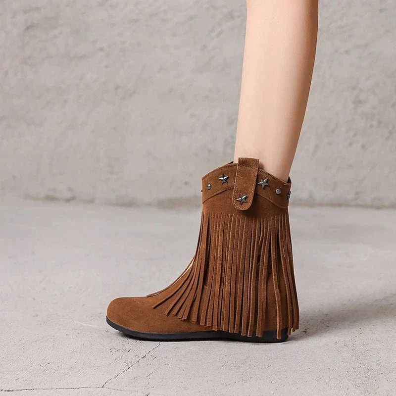 Dags att höja din western-look till nya höjder! Våra cowgirl-ankelboots i mjuk mocka är precis vad du behöver för att sätta en självsäker, feminin och trendriktig prägel på dina outfits. Med sina flörtiga fransar, eleganta stjärndetaljer och höjdförhöjande sula får du både komfort och karaktär – oavsett om du rider genom stan eller dansar natten lång.