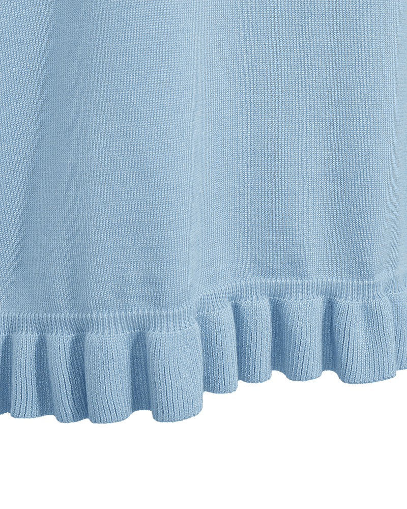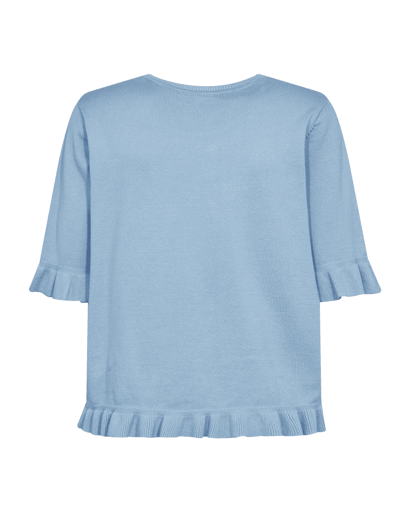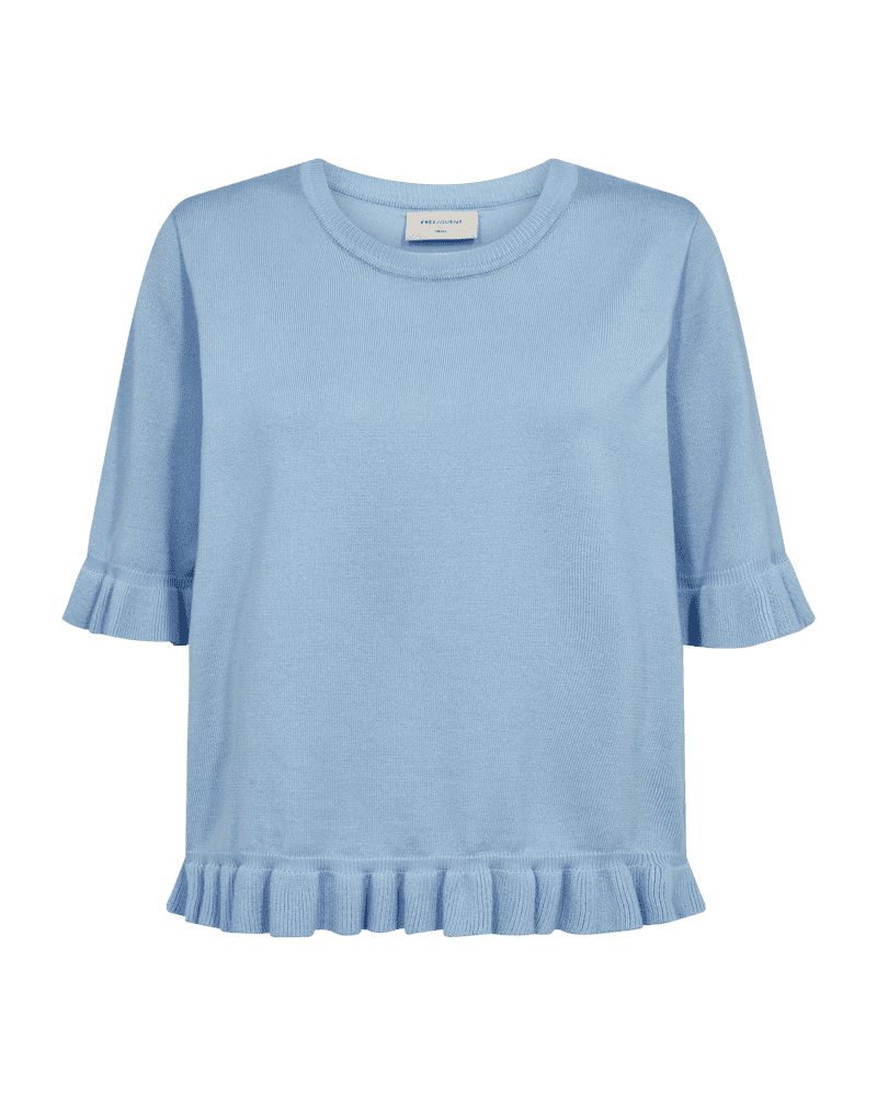 Härlig finstickad jumper med volangdetaljer från FREE/QUENT. Rund hals och ärm i armbågslängd med volangkant vid ärmslut. Även fin volangkant nedtill.