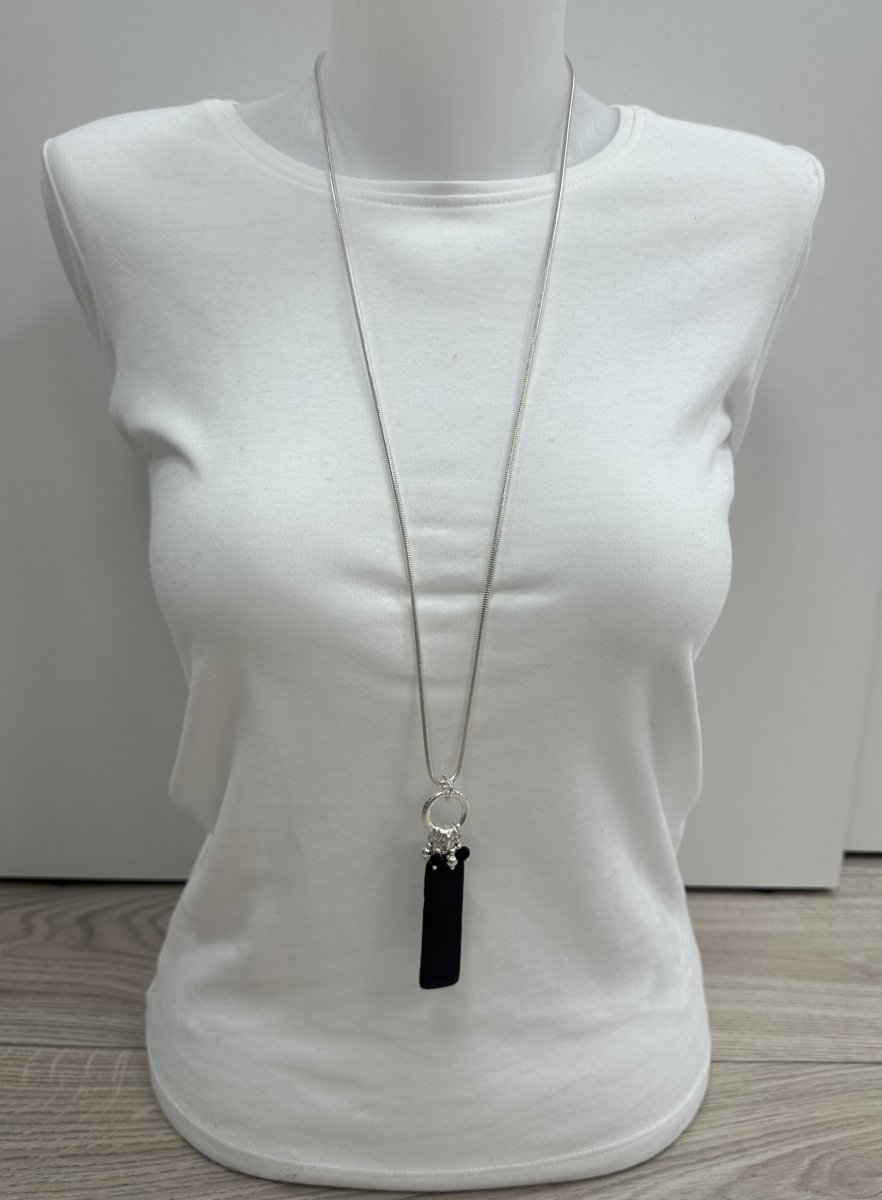 Långt halsband med svart hänge på silverfärgad kedja.