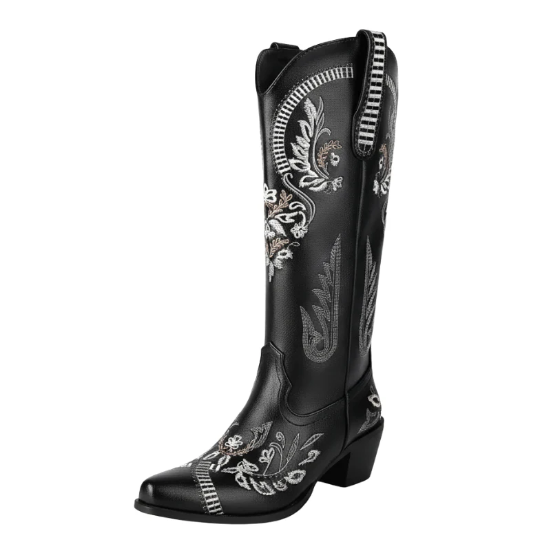 Kliv in i rampljuset med våra höga cowboy boots – den perfekta mixen av westernkänsla och feminin styrka. De är inte bara ett par skor, utan en känsla. Med sina utsökta broderier, robusta klack och slanka silhuett är de designade för att du ska känna dig självsäker, bekväm och oemotståndligt stilren – oavsett om du är på en countryfest, festival eller bara vill addera edge till din vardagslook.