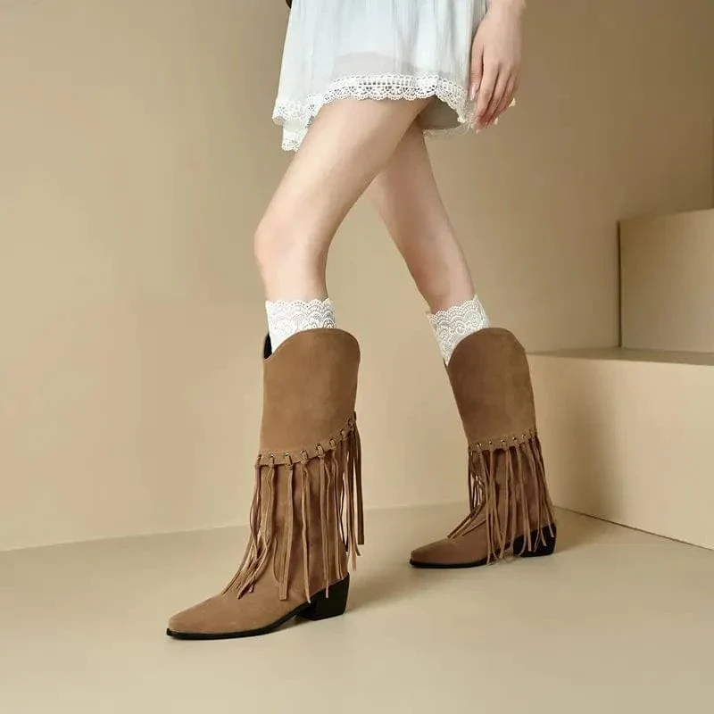 Drömmer du om att fånga den där autentiska westernkänslan – med en modern och elegant twist? Våra höga cowboyboots med fransar i mjuk mockalook är skapade för dig som älskar frihet, rörelse och stil. Oavsett om du kliver ut på festivalfältet eller dansar under stjärnorna, blir de här stövlarna din trogna följeslagare.