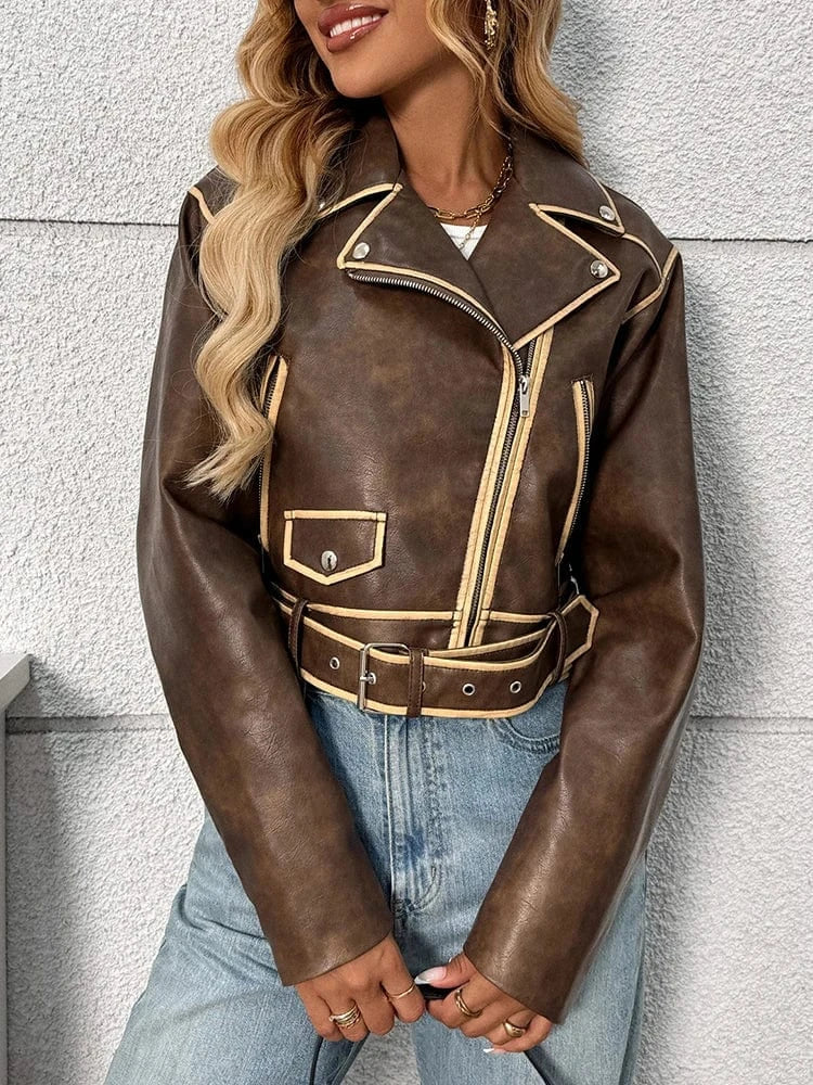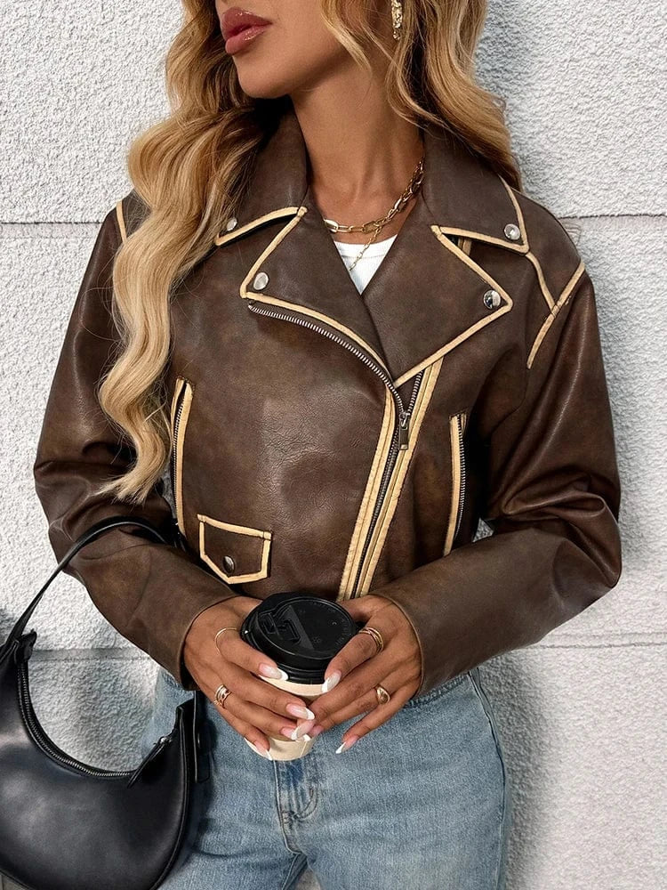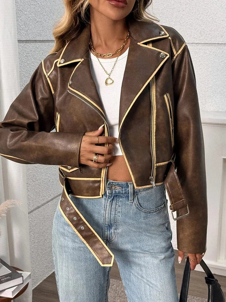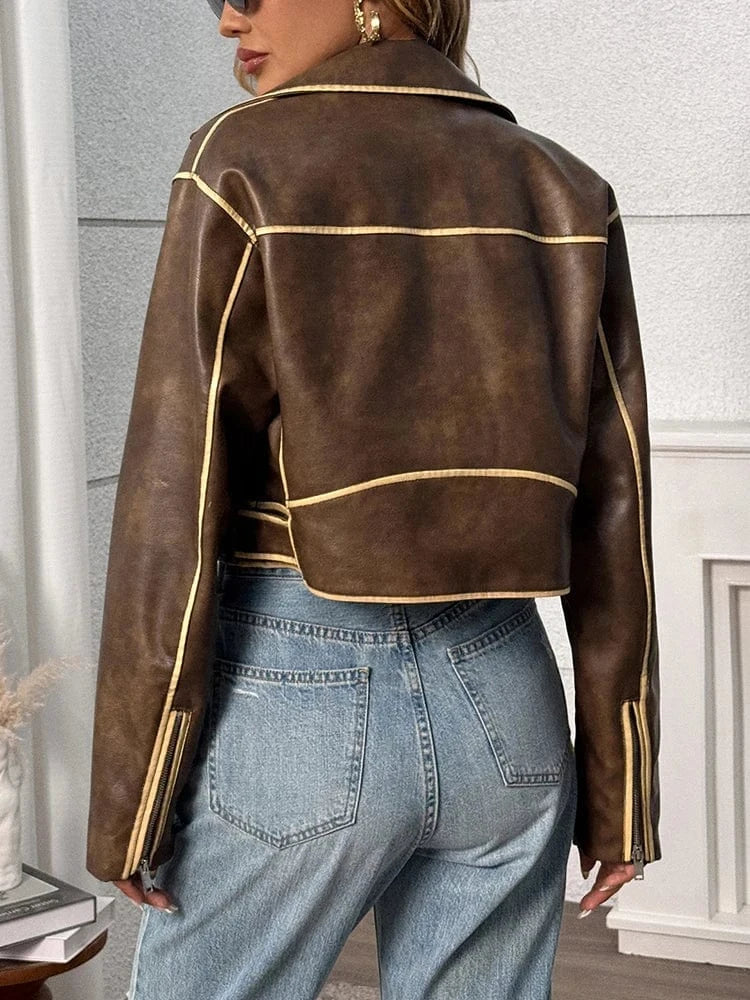 Ge din garderob ett uppsving med denna eleganta bruna jacka i skinnimitation. Perfekt för dig som vill kombinera vintage-känsla med modern stil, oavsett om du är på väg till jobbet eller ut på stan.