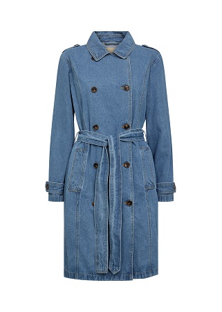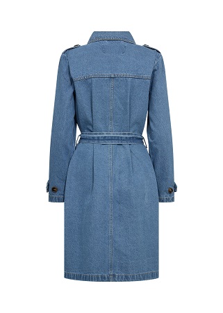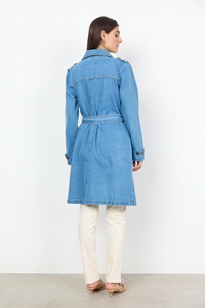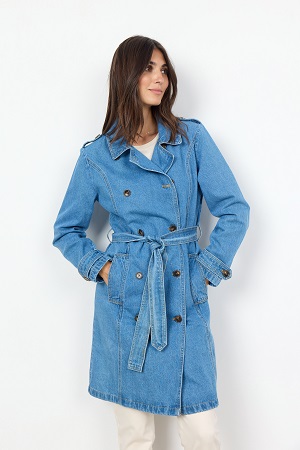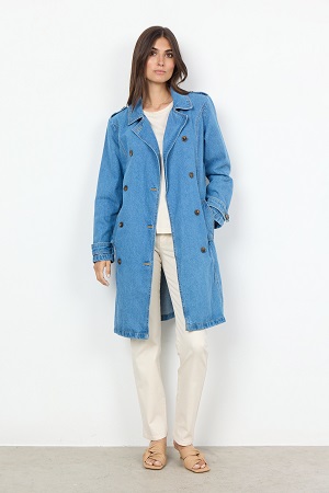 Trendig jeanskappa från Soya Concept. Denna dubbelknäppta kappa har en klassisk krage, snedställda fickor, ett bälte och långa ärmar. Med snygga detaljer på axlarna och en smickrande midilängd är denna kappa perfekt för att skapa en trendig look.