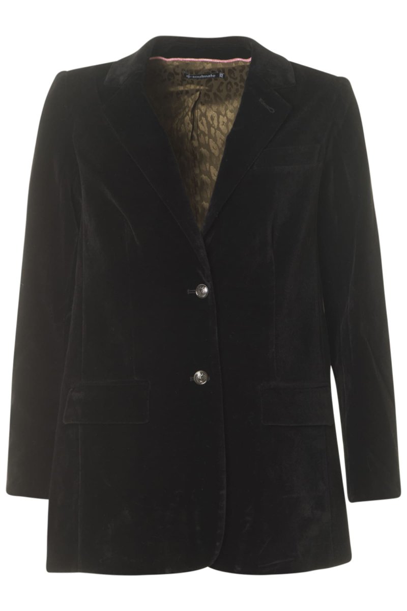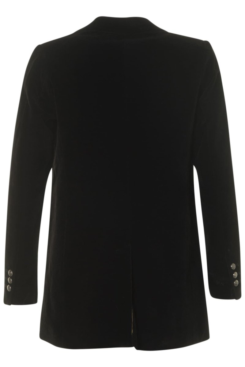 Jätte fin sammetskavaj med mönstrat foder. Två knappar fram och tre vid ärmsluten. Något längre och rakare modell.
