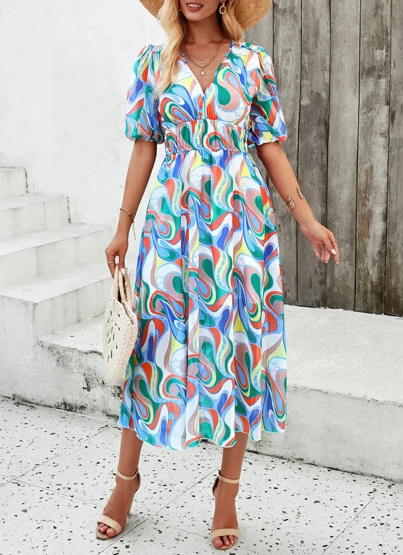 Upplev friheten och glädjen av sommaren i denna vackra blommiga klänning. En tidlös klassiker som förvandlar varje dag till ett speciellt tillfälle – från strandpromenader till kvällsfester.