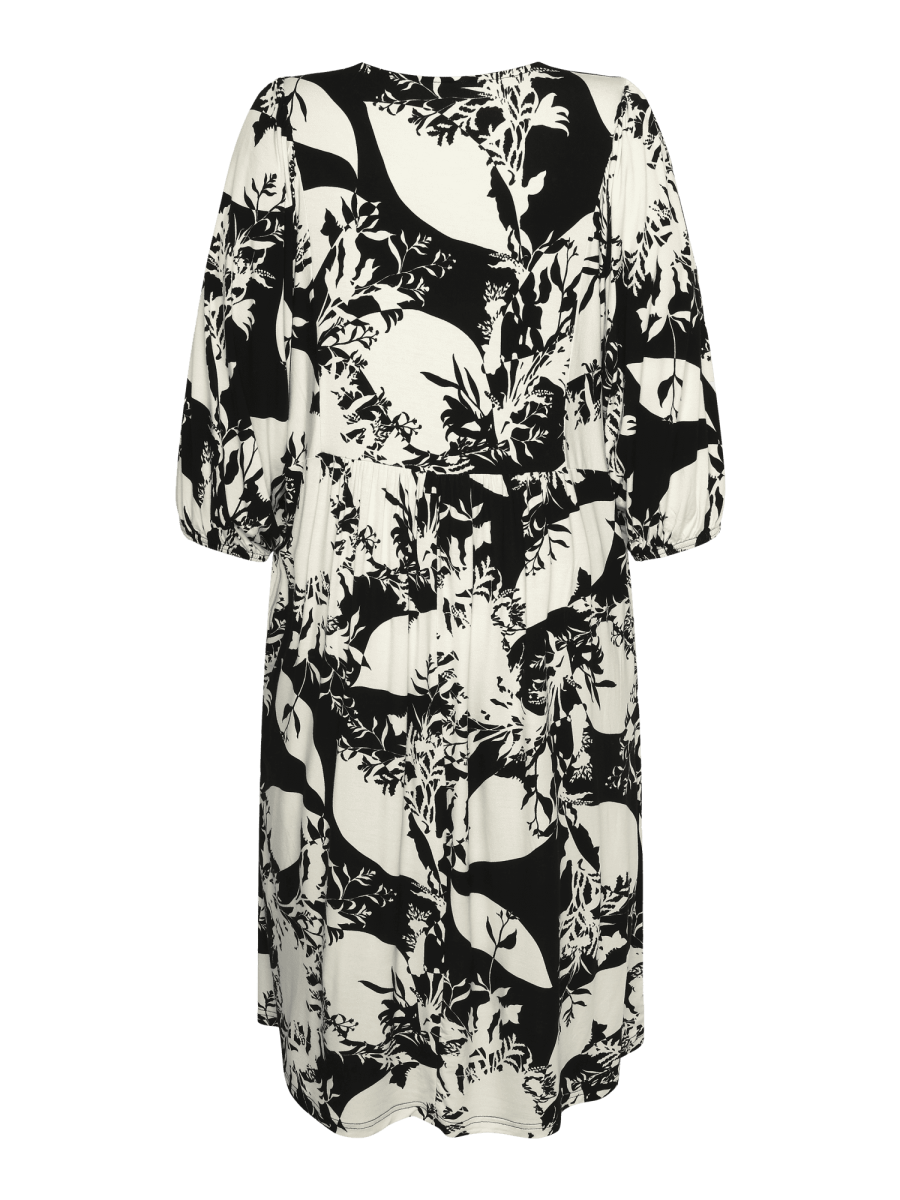 Klänningen har 3/4 lång ärm sam tett resårband vid ärmslut. Fickor i sidan och resårband i midjan för fin passform.
