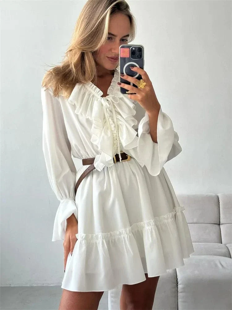Upplev den perfekta blandningen av romantik och avslappnad elegans med vår klänning med volanger. Med sina mjuka linjer, fladdrande tyg och feminina detaljer blir detta snabbt din nya favorit för både vardag och fest.