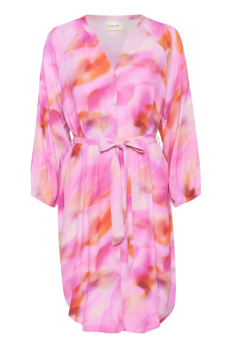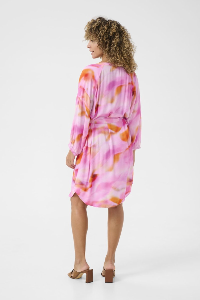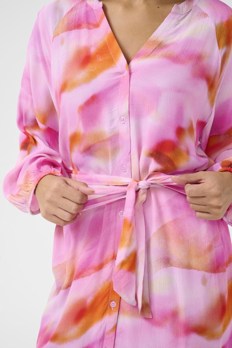 Snygg skjortklänning i härliga toner av rosa och orange. Klänningen har rund hals med V-slits samt 3/4 lång ärm. Knäppning framtill och knytband i midjan.