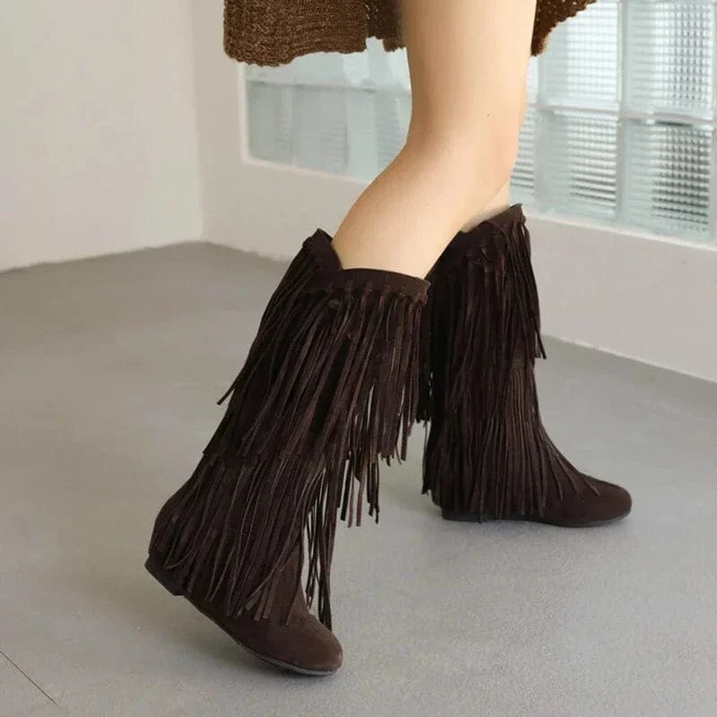 Letar du efter ett par boots som verkligen sticker ut? De här höga cowboystövlarna med generösa mockafransa är allt du drömmer om – bohemisk elegans möter western edge. Oavsett om du stylar dem till en stickad klänning, jeansshorts eller en flowy kjol, kommer de här stövlarna få varje outfit att kännas genomtänkt och självsäker.
