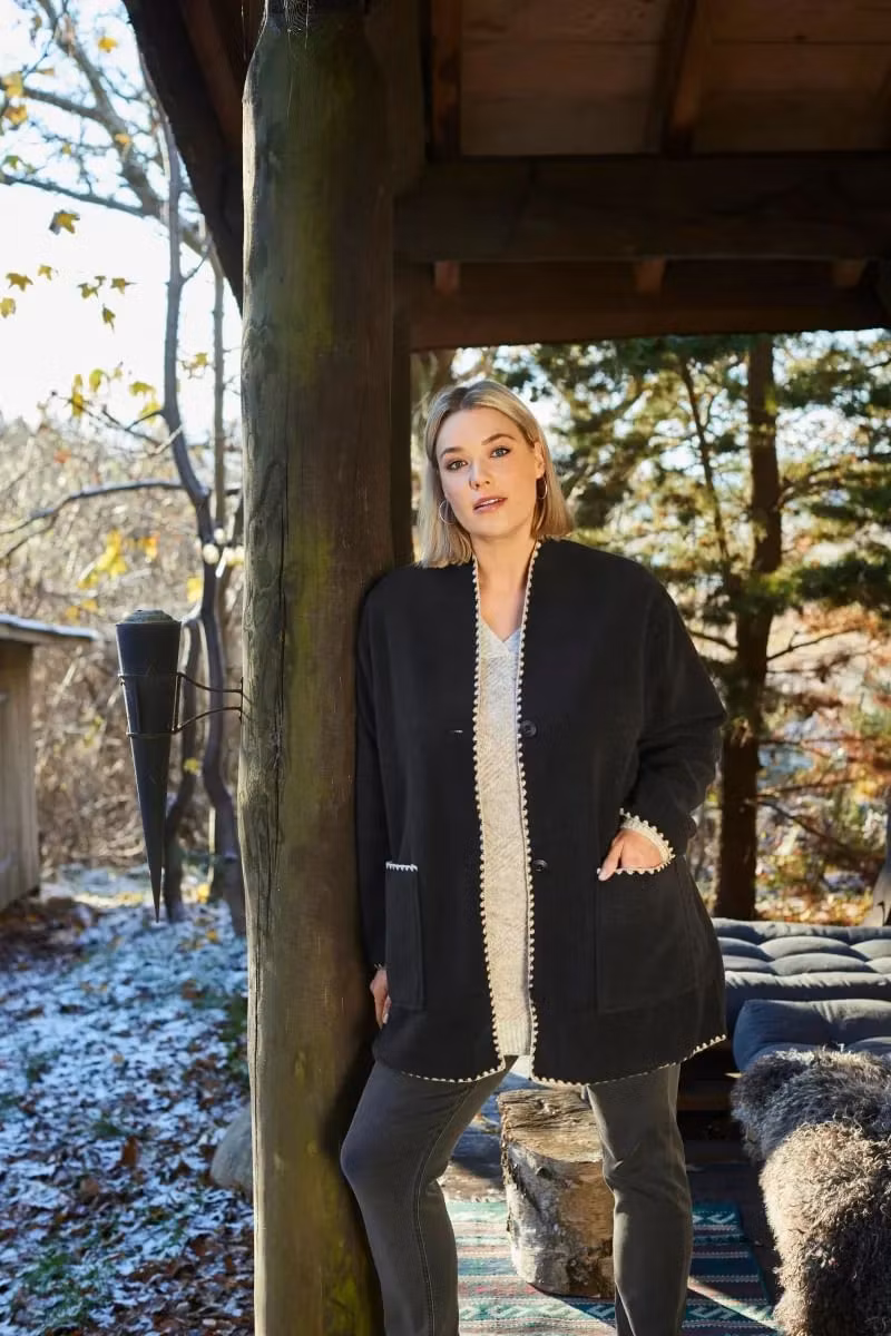 En jätte snygg kofta / tunnare jacka i liknande filt kvalitet. Svart med beige stickningar. Två stora fickor och tre knappar.