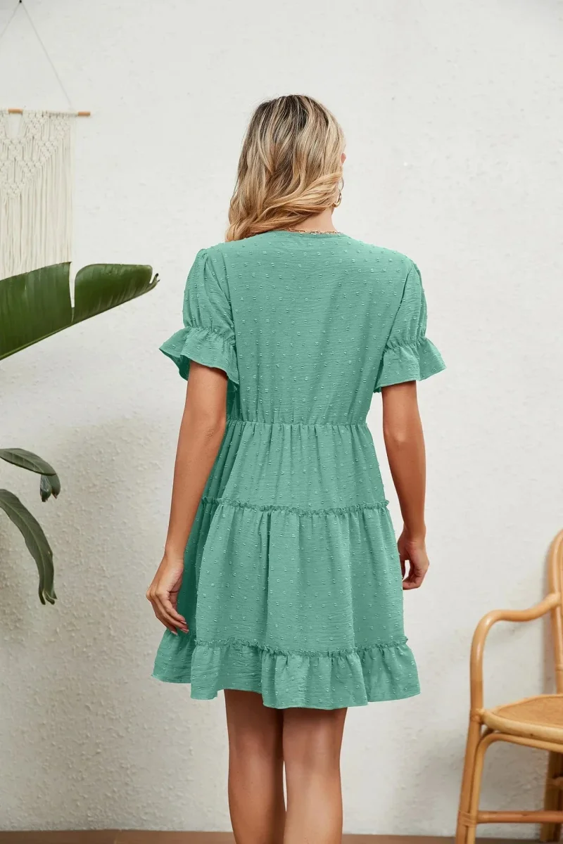 Fånga sommarens frihet och stil med denna korta klänning som är lika bekväm som den är elegant. Perfekt för strandpromenader, picknickar eller en dag på stan.