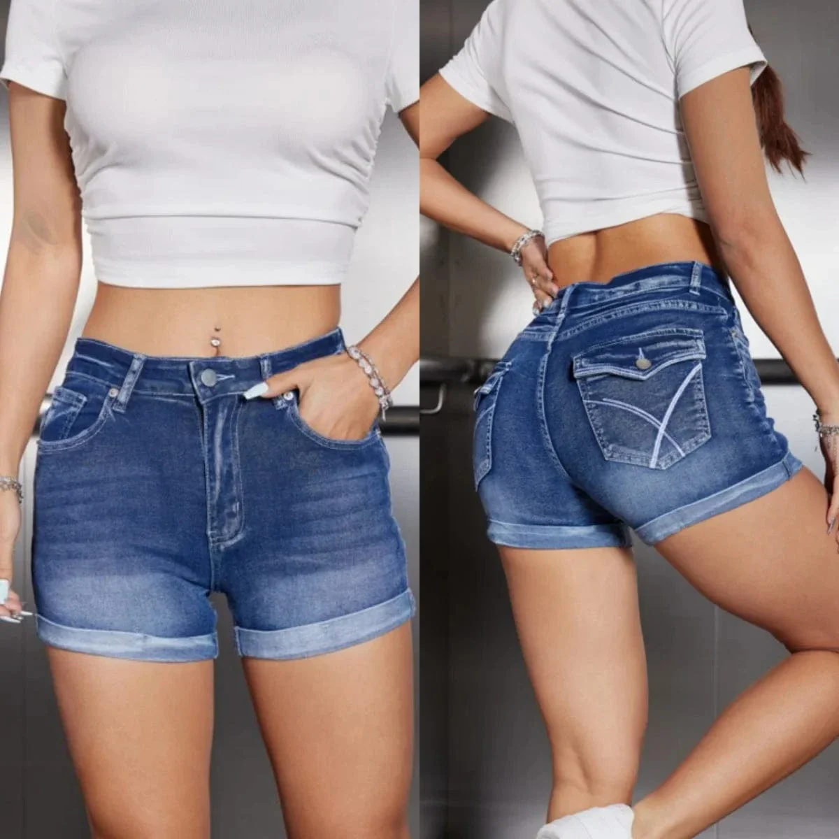 Ge din sommarlook en djärv och formande touch med dessa korta blå jeansshorts med uppvik. Designade för att framhäva din figur, utan att kompromissa med komfort eller stil.