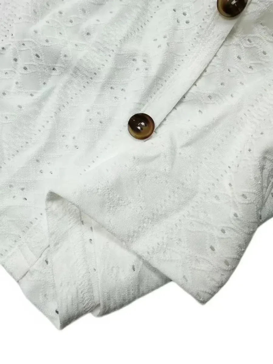 Skapa en tidlöst chic stil med denna kortärmade vita blus. Med sina dekorativa hålbroderier, knäppning framtill och mjuka stretchiga material är den det perfekta valet för en luftig och elegant sommaroutfit.