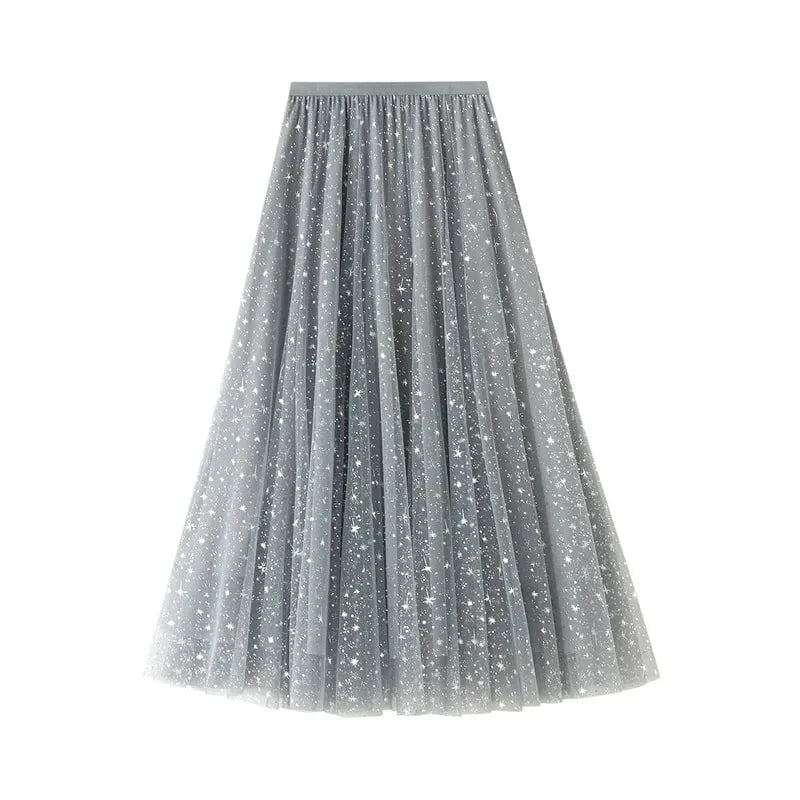 Dröm dig bort under stjärnorna – fast på dagtid. Den här långa tyllkjolen med gnistrande stjärnmotiv ger dig en sagolik aura och en mjuk, följsam känsla som dansar med varje steg du tar.