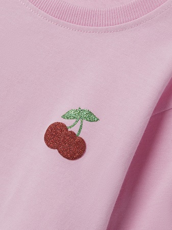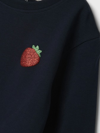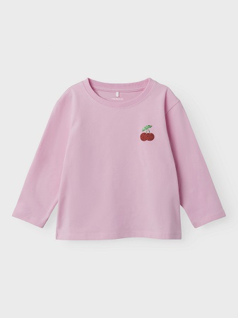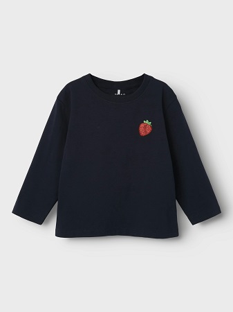 Superfin topp från Name It. Denna topp har långa ärmar och en klassisk rund halsringning, vilket gör den både bekväm och tidlös. Tillverkad i en mjuk och skön kvalitet. Toppen har en fin design som pryds med en söt jordgubbe och ett körsbär.