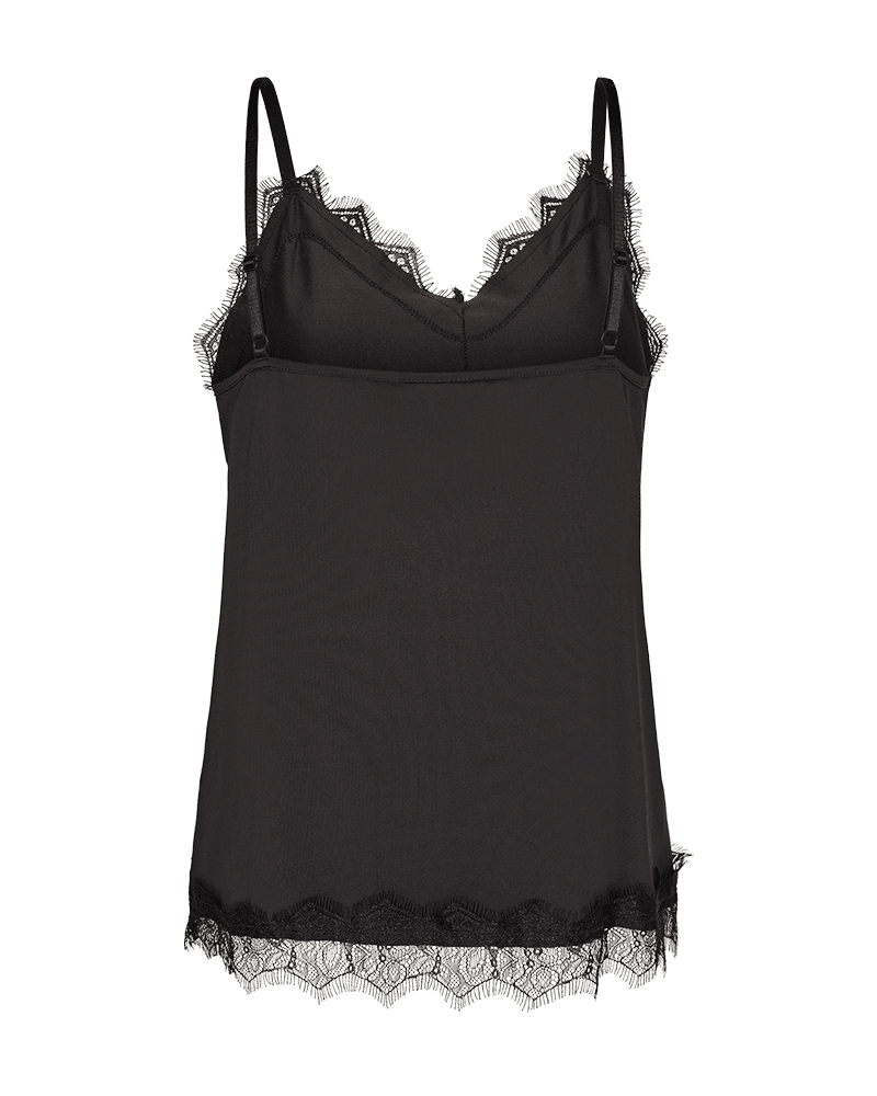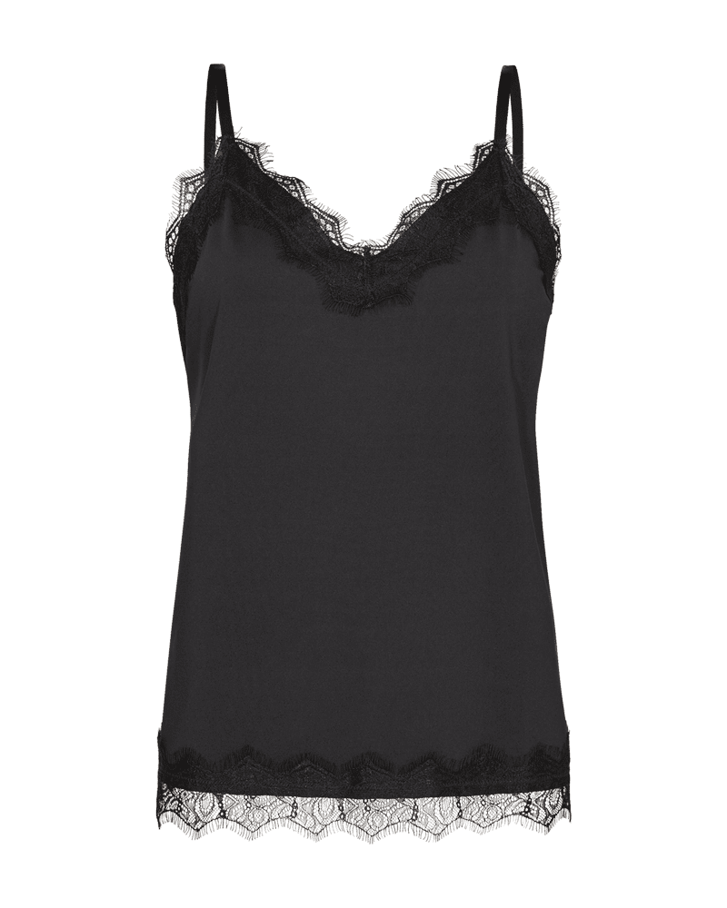 Detta snygga linne med spetskant kommer från FREE/QUENT. Linnet har en smickrande v-ringning, justerbara axelband och är avslappnad i passformen vilket gör den bekväm att bära som den är eller som lager på lager.
