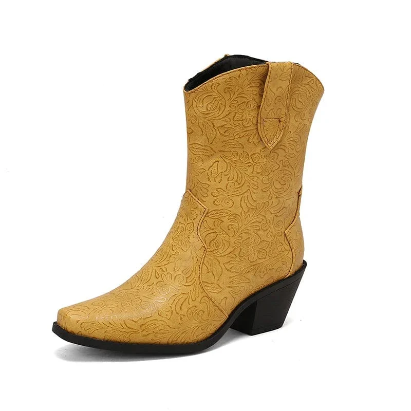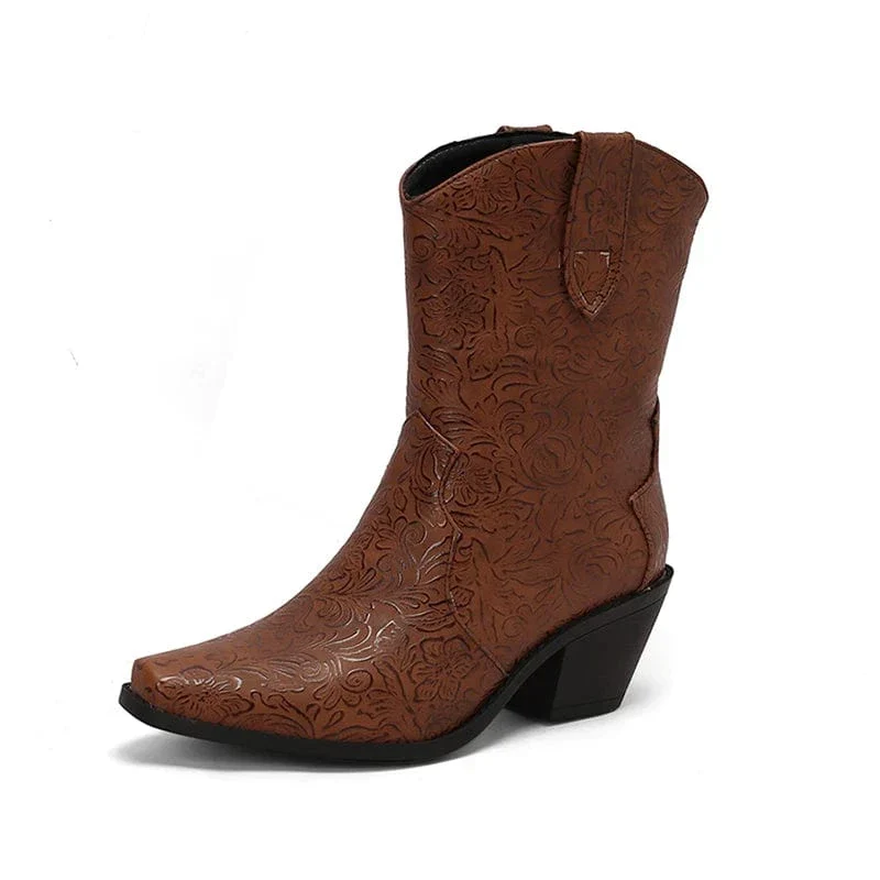 Drömmer du om boots som kombinerar retrokänsla med modern attityd? Våra mönstrade låga cowboyboots för dam är precis vad din garderob behöver. Med sin eleganta siluett, dekorativa sömmar och kraftfulla klackar ger de varje steg karaktär – oavsett om du rider in i solnedgången eller kliver in på stan.