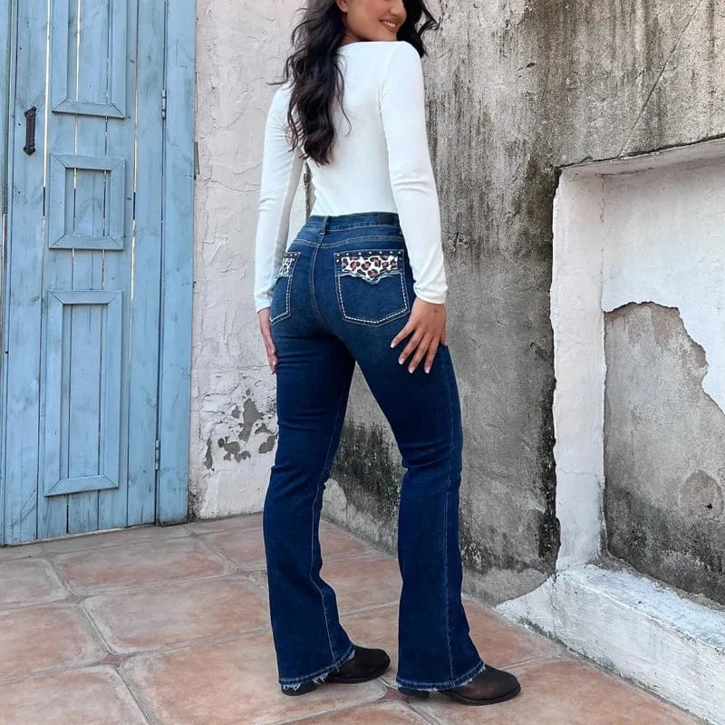 Mörkblå bootcut jeans med leopardmönster – sätt tänderna i din nya favoritlook