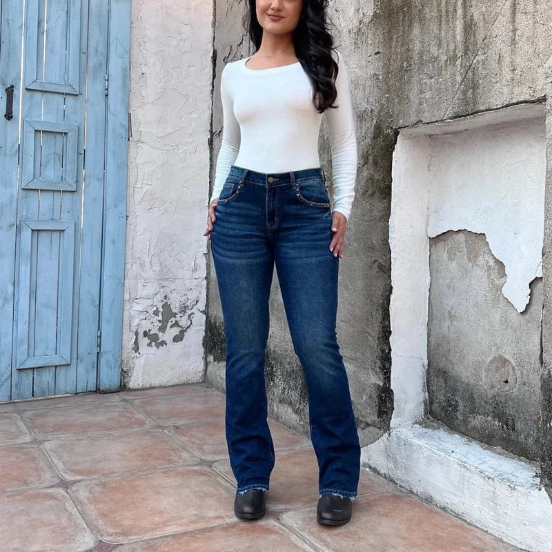 Gör entré med stil i dessa mörkblå bootcut jeans där klassisk denim möter vild attityd. De subtilt målade leoparddetaljerna på bakfickorna adderar precis rätt mängd edge till din vardagslook.