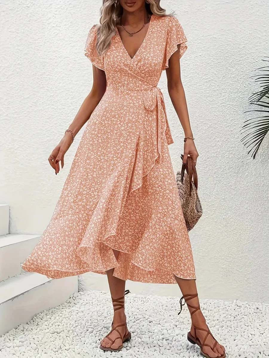 Känn dig fri och elegant i denna omlottklänning med romantiskt blommönster. Perfekt för sommarens äventyr, från picknickar på ängen till kvällar vid strandpromenaden.