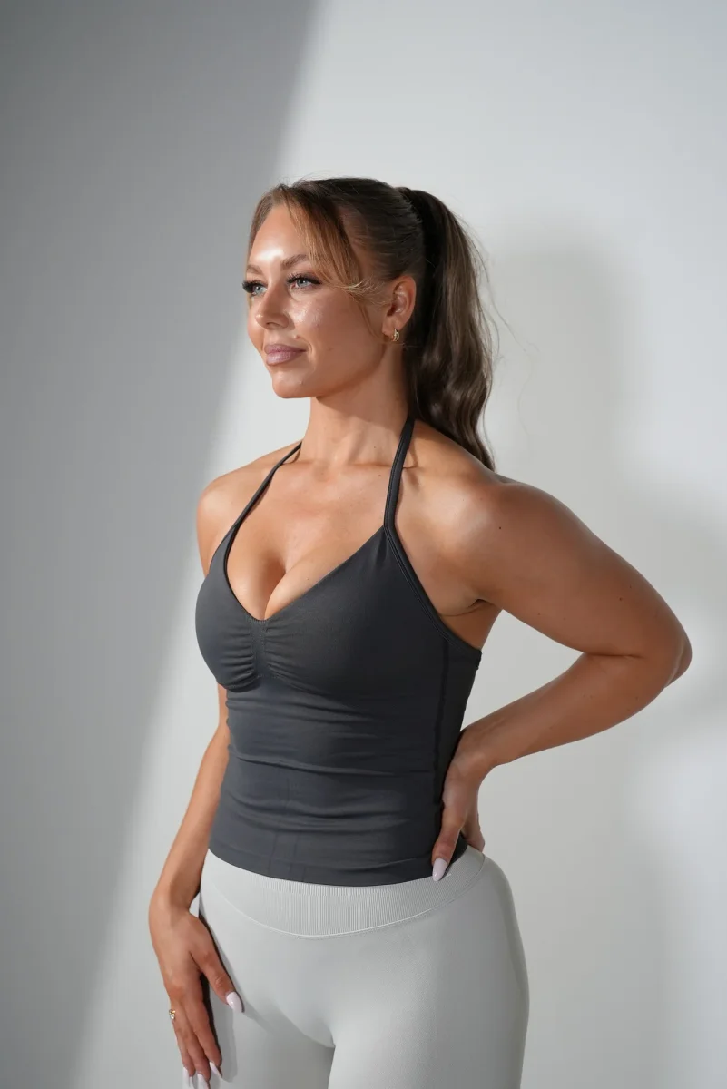 Denna topp kombinerar en sportig silhuett med en feminin touch, tack vare den smala halterneck-designen och cami-inspirerade snittet. Den djupa urringningen och kroppsnära passformen lyfter fram dina former och ger dig både stil och stöd – oavsett om du tränar, poserar eller bara är on-the-go.