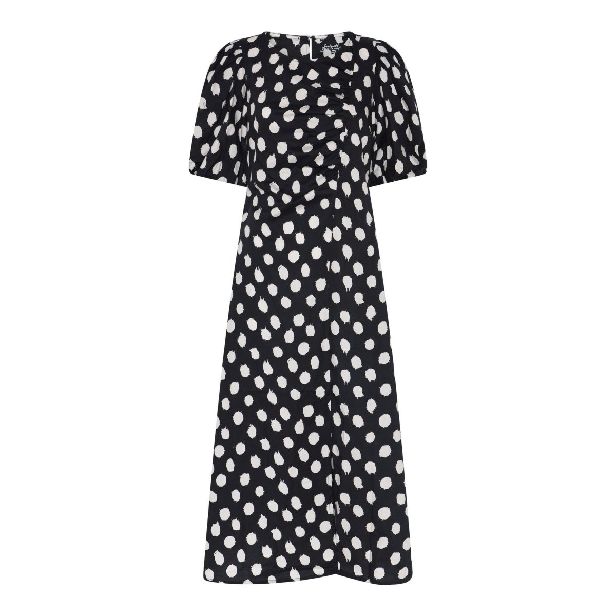 Denna fina prickiga klänning kommer från Soulmate. klänningen har rund hals med en knapp bak och kort puffärm med resår samt fickor. Slits nedtill fram.