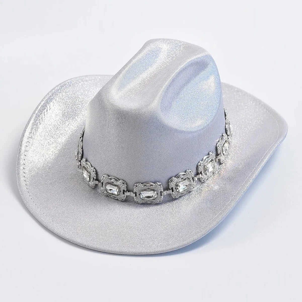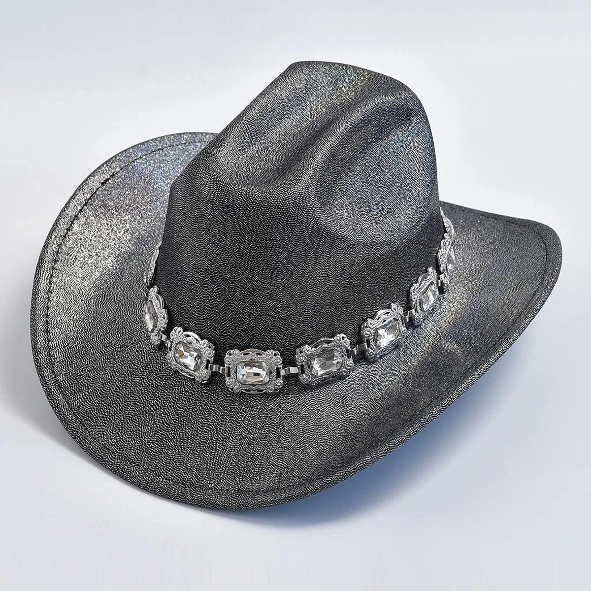 Låt din inre cowgirl glänsa med vår Rhinestone Fedora Cowboyhatt – den perfekta kombinationen av glamour och vilda västern. Med sitt skimrande material och eleganta strassband blir den här hatten ett statement för alla tillfällen, oavsett om du ska på fest, bröllop eller bara vill höja din stil till nästa nivå.